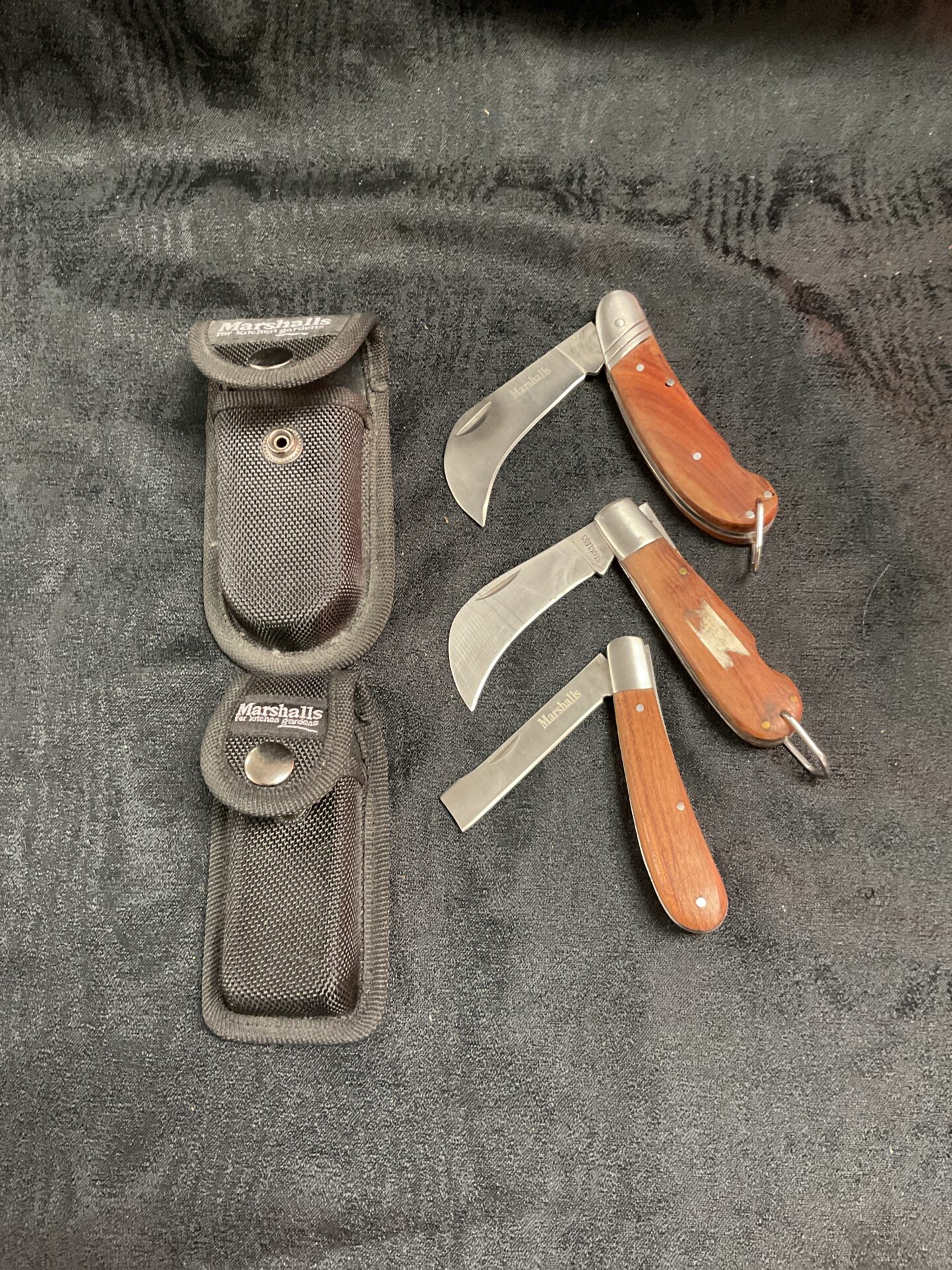 This lot comprises three garden pruning knives, each featuring a curved blade designed for harvesting fruit, pruning branches, and general garden maintenance. The knives have wooden handles, providing a comfortable grip, and each comes with a black nylon sheath for safe storage and portability. These tools appear to be designed for both professional and amateur gardeners, offering a traditional approach to orchard and garden care.