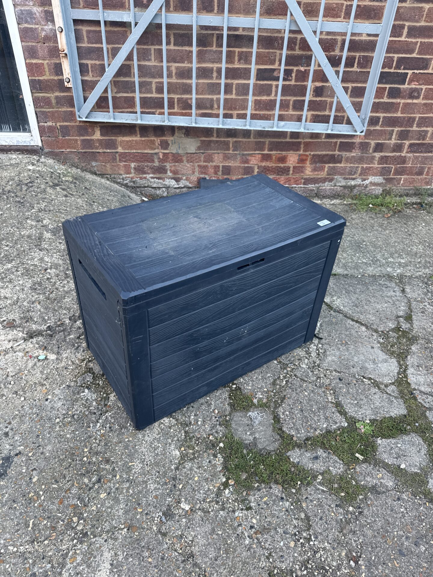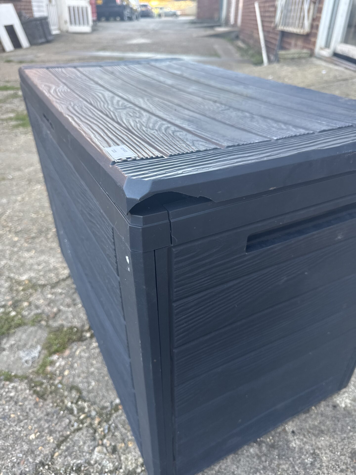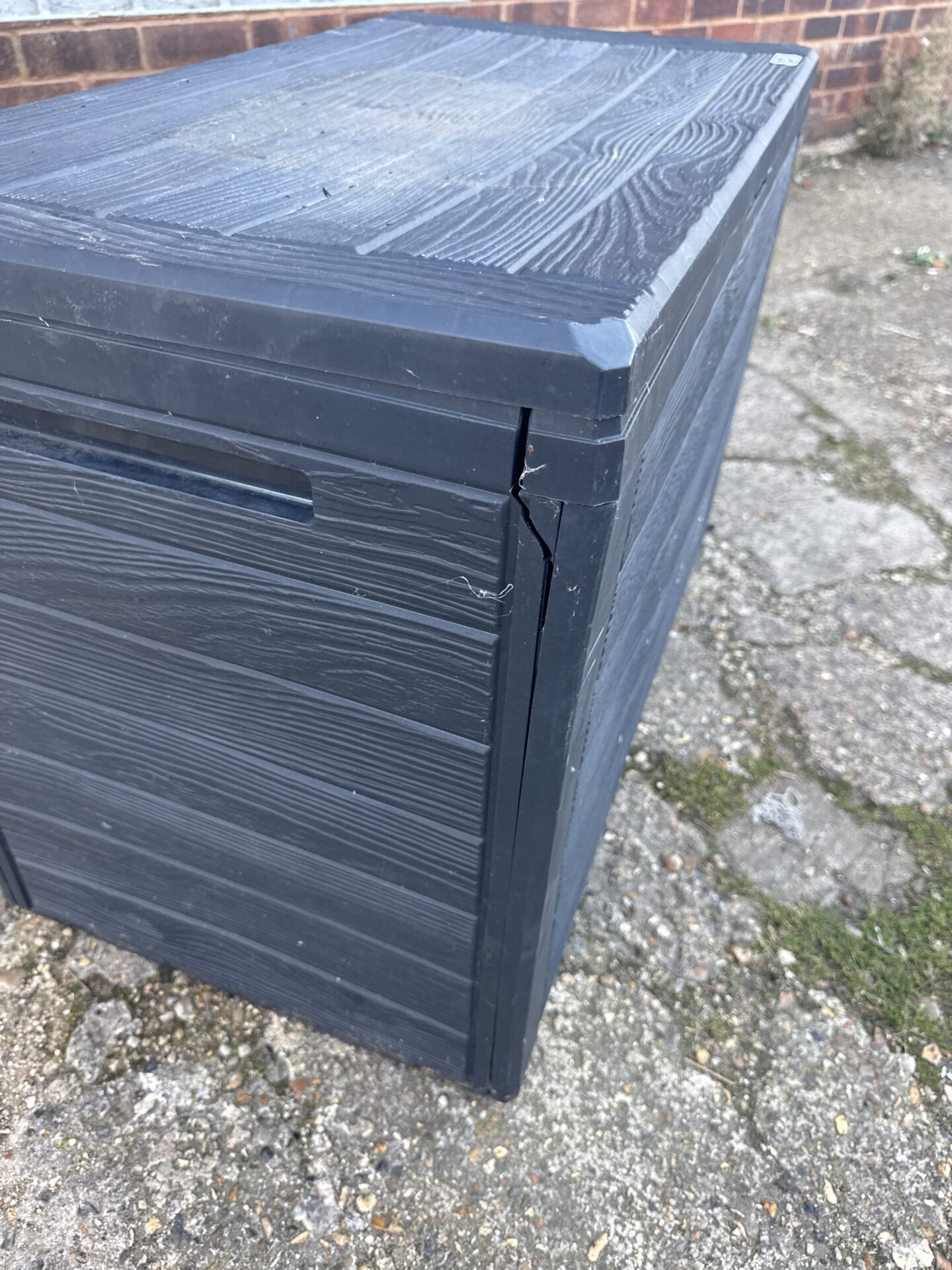 This storage bin shows signs of wear consistent with outdoor use, including some damage to both ends as pictured. Despite this, it remains fully functional and offers a cost-effective storage solution. It would be ideal for someone seeking a practical, no-frills storage option for their garden, or a DIY enthusiast looking to repair and restore it.
