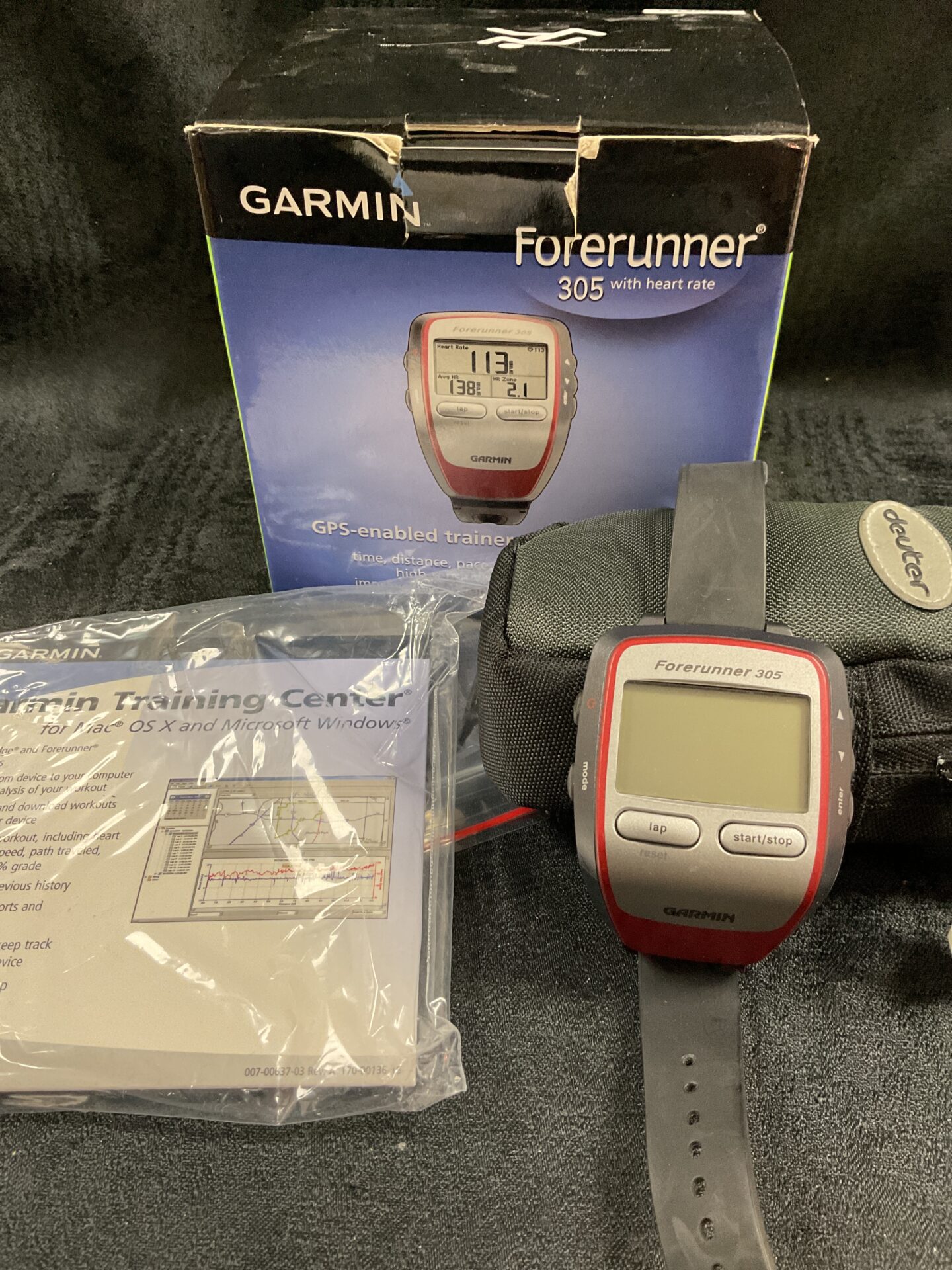 This is a Garmin Forerunner 305, a GPS-enabled fitness watch designed for runners and athletes. This model features a built-in heart rate monitor and provides detailed data on pace, distance, and time. The Forerunner 305 was a popular choice for its accuracy and ease of use, allowing users to track their workouts and monitor their progress effectively.
