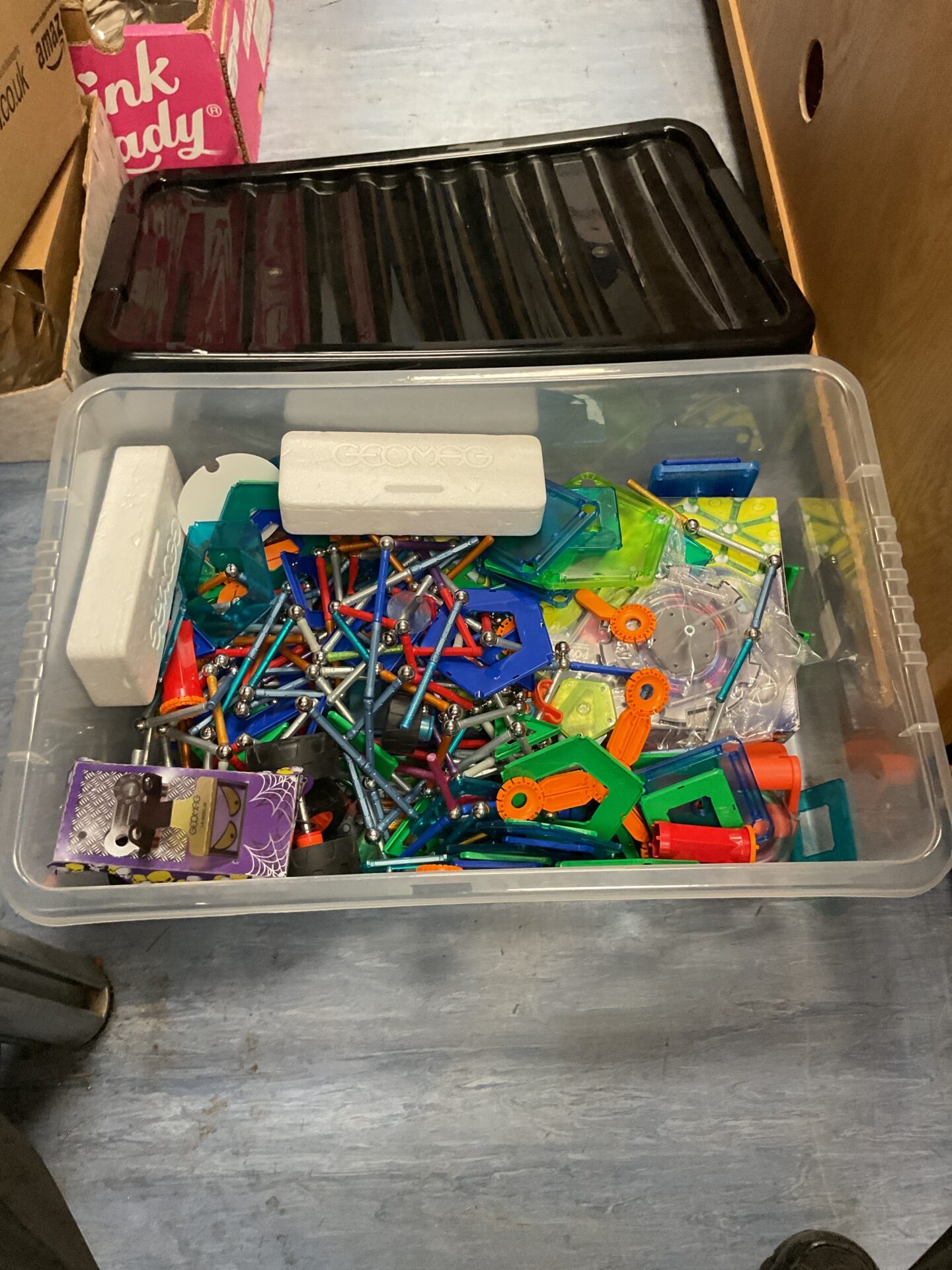 The Geomag pieces are presented as a mixed lot, showing signs of play and handling. While the pieces appear generally intact, a detailed inspection for missing or damaged components is recommended. This lot would appeal to collectors of vintage or unusual toys, or those seeking to expand an existing Geomag collection, or for use in creative projects.