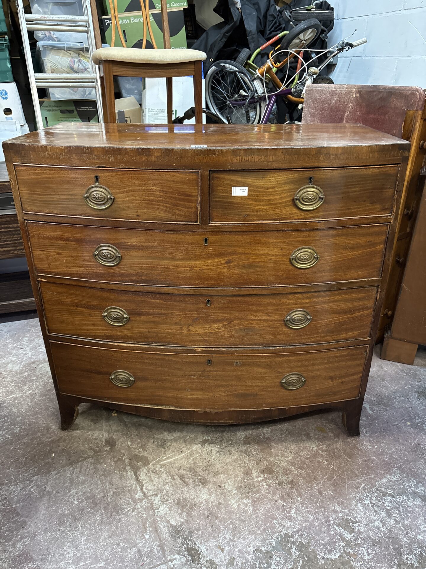 This George III mahogany chest of drawers presents a classic example of 18th-century furniture design. The chest features a desirable bow fronted construction, enhancing its elegant silhouette. Crafted from rich mahogany, it boasts a warm patina developed over time, and is adorned with brass handles, adding a touch of refinement. The construction suggests a high level of craftsmanship typical of the period.