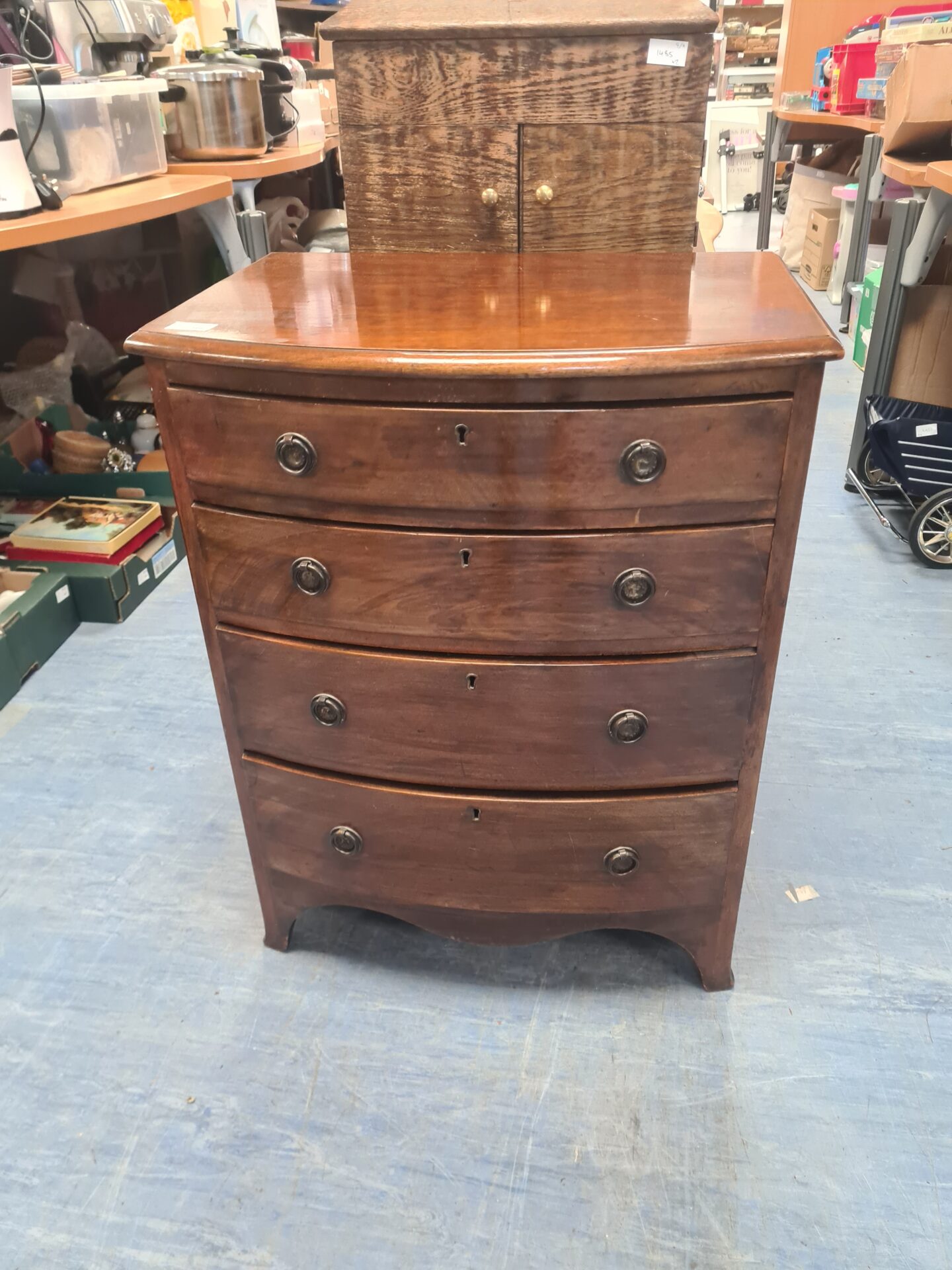 This is a handsome Georgian chest of drawers, exhibiting a classic bow-fronted design. Constructed from mahogany, it features four graduated drawers, each with original handles. The chest’s design and construction suggest it dates to the late 18th or early 19th century, a period known for refined craftsmanship and elegant furniture forms.