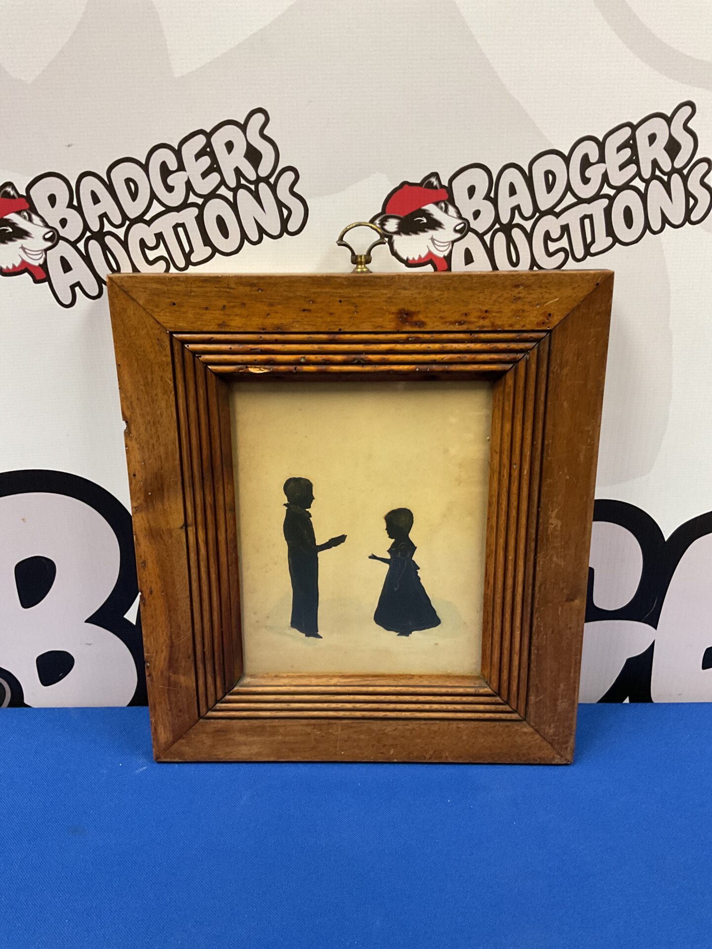 This is a charming Georgian silhouette portrait depicting a young boy and girl. Executed in profile, the figures are delicately cut from paper and mounted within a simple, yet elegant, frame. Silhouettes were a popular form of portraiture during the Georgian and Regency periods, offering an affordable way to capture likenesses and decorate homes. This example showcases the refined aesthetic of the era, with its focus on line and form.