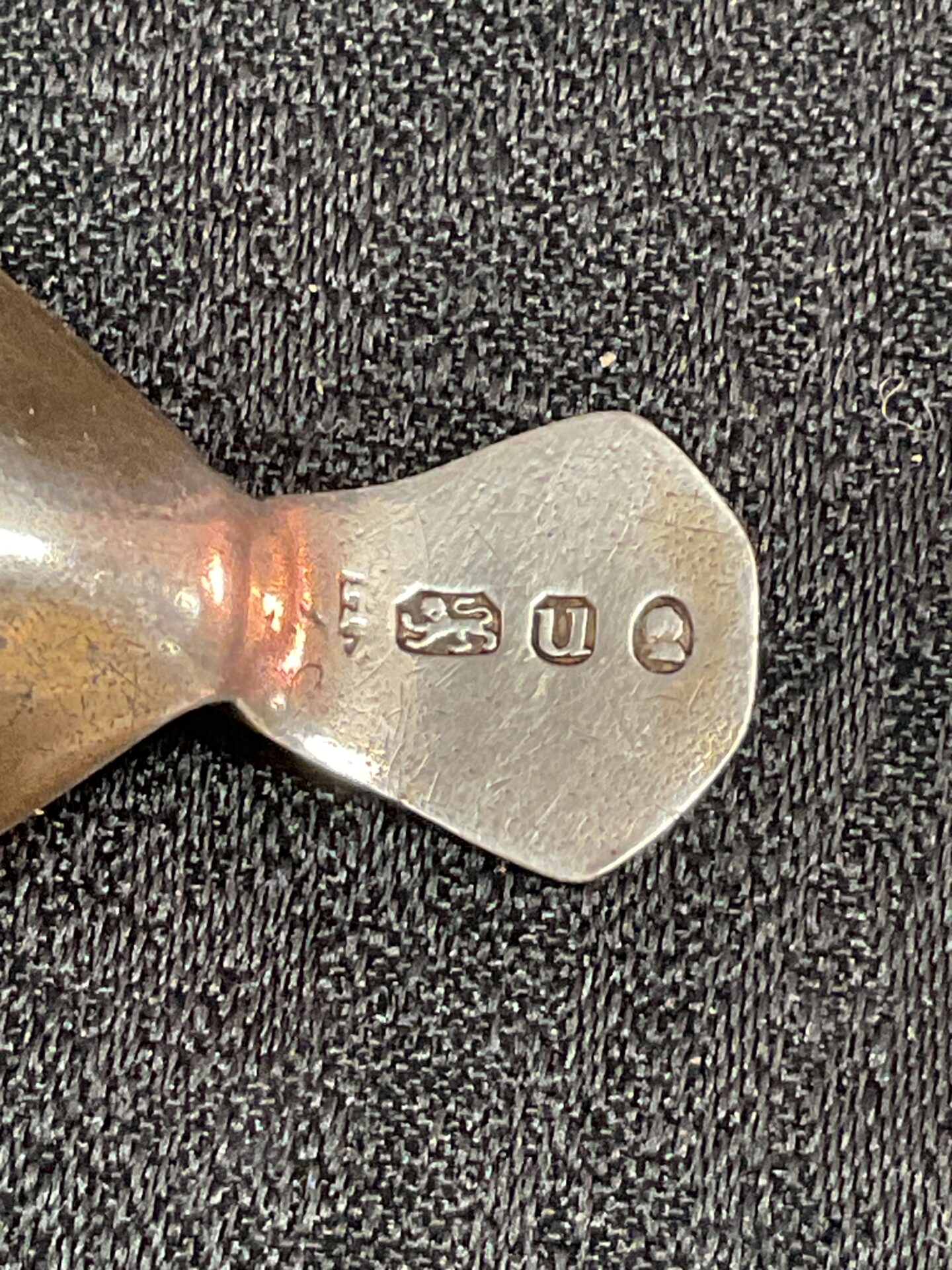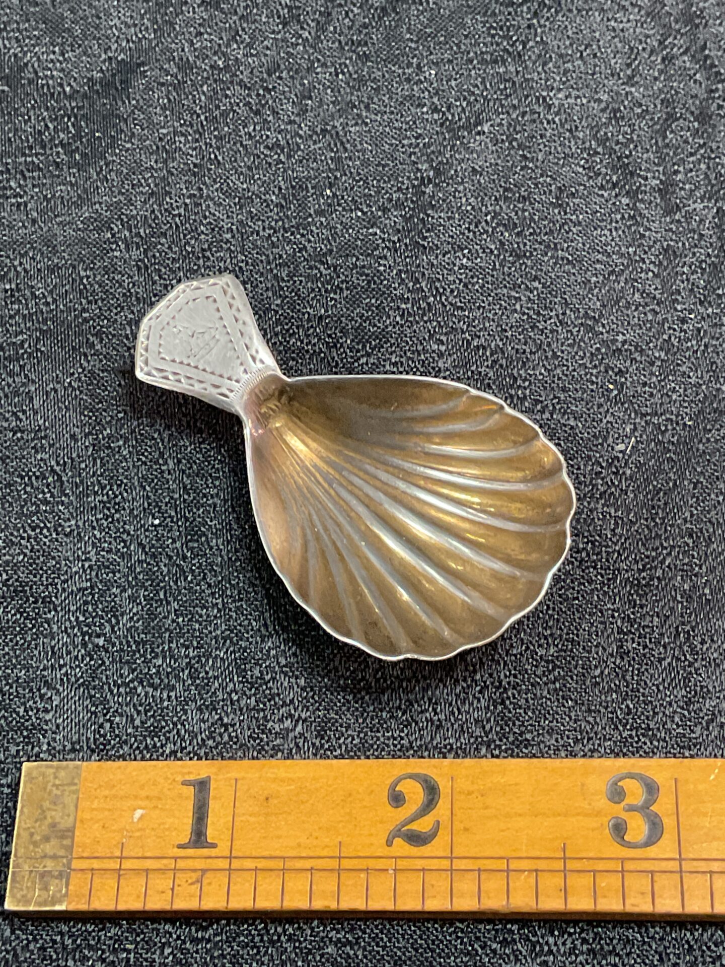 This is a charming Georgian silver caddy spoon, crafted in a shell-shaped design. The spoon features a beautifully shaped handle terminating in a pointed finial. Hallmarked silver ensures its authenticity and age, making it a delightful example of antique silverware.