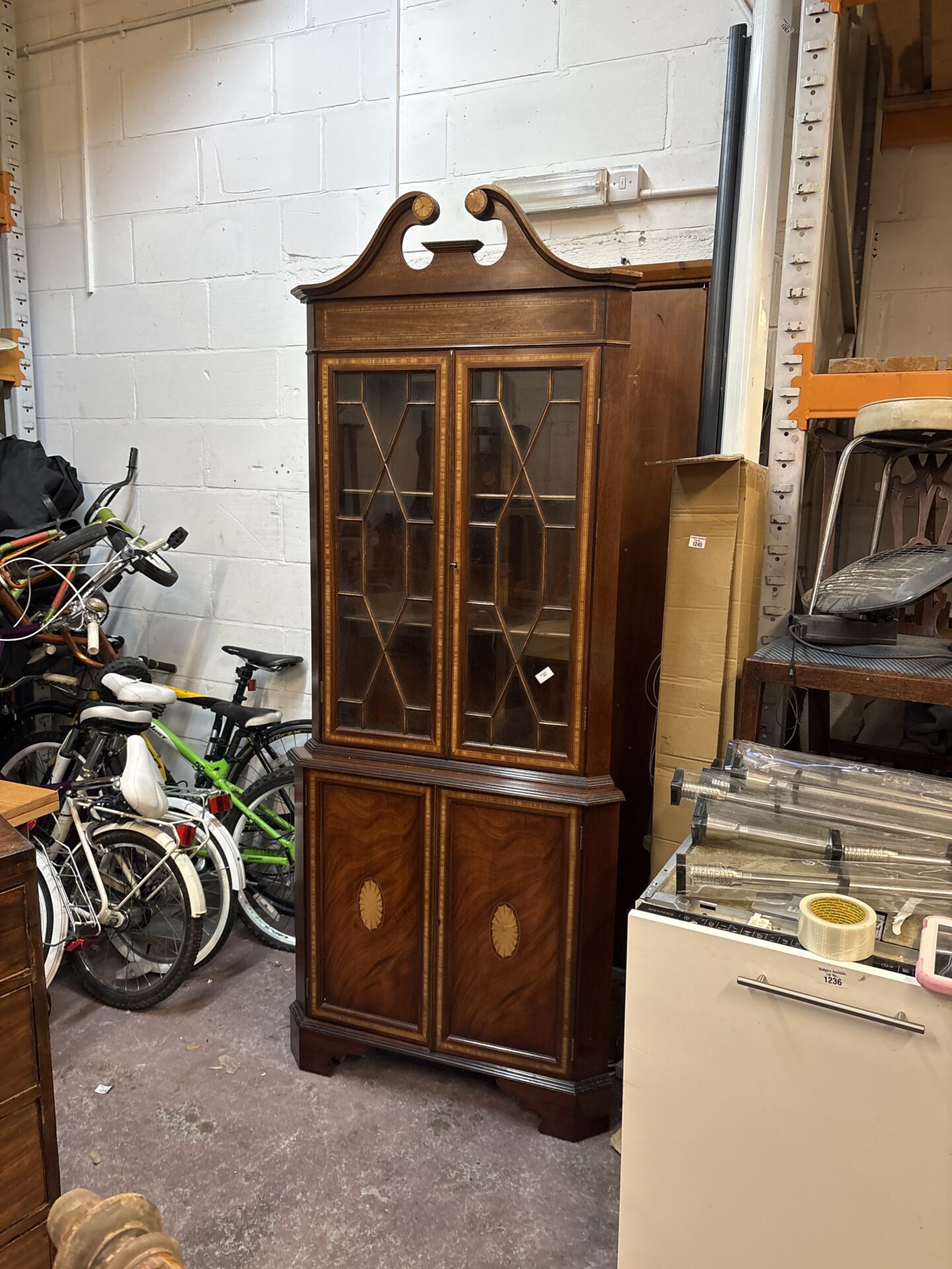 This elegant corner display cabinet is crafted from rich mahogany and features delicate inlaid detailing. The cabinet showcases a classic Georgian style, with a shaped pediment and glazed doors allowing for the display of treasured collectibles. The interior offers adjustable shelving, providing versatile storage and display options.