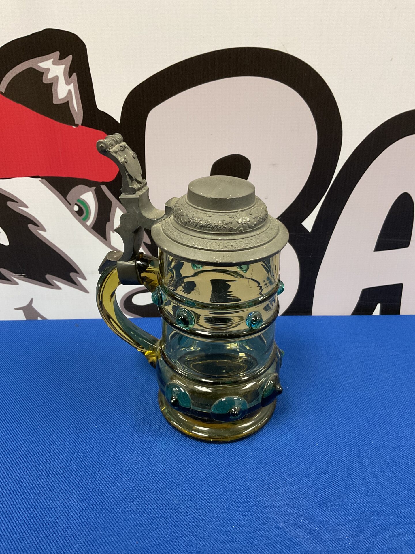 This stein exhibits signs of age and wear consistent with its antique status. While it is not new, it retains its character and charm, making it a desirable piece for collectors of German memorabilia or antique glassware. The combination of glass and pewter, along with its vintage appeal, makes this stein a unique addition to any collection or a conversation starter for display.