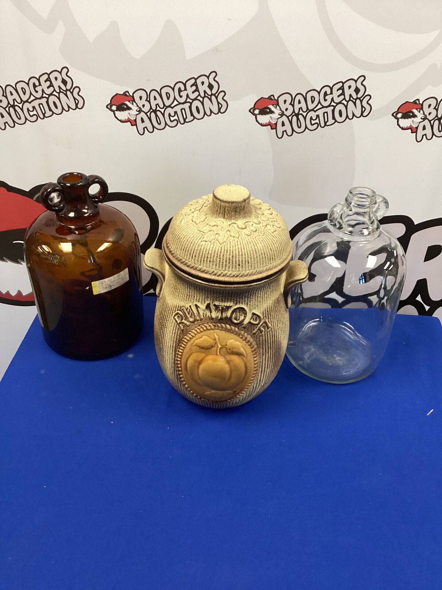 This lot features a traditional German Rumtopf jar, a stoneware vessel historically used for preserving fruits in rum or brandy. The jar is accompanied by two demi johns, likely used in conjunction with the Rumtopf for the preservation process or storage of the infused fruits. The jar itself is beautifully crafted, showcasing the characteristic stoneware aesthetic of German pottery, and is a wonderful example of traditional kitchenware.