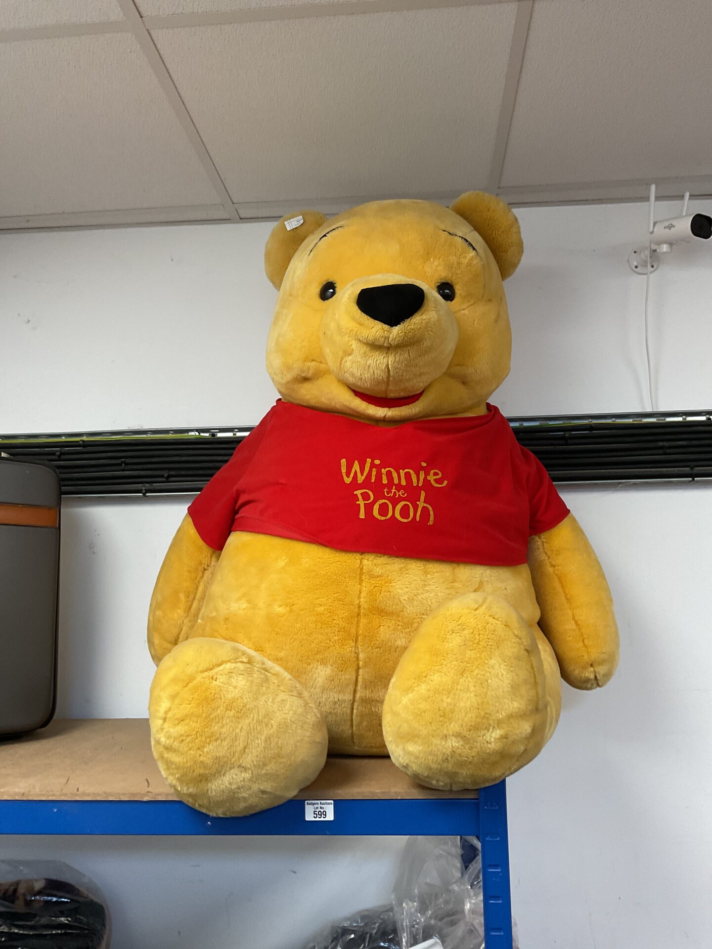This giant Winnie the Pooh teddy is a delightful addition to any collection or playroom. Crafted from soft plush, this oversized bear features classic embroidered details. A charming and substantial piece for Disney fans and collectors alike.