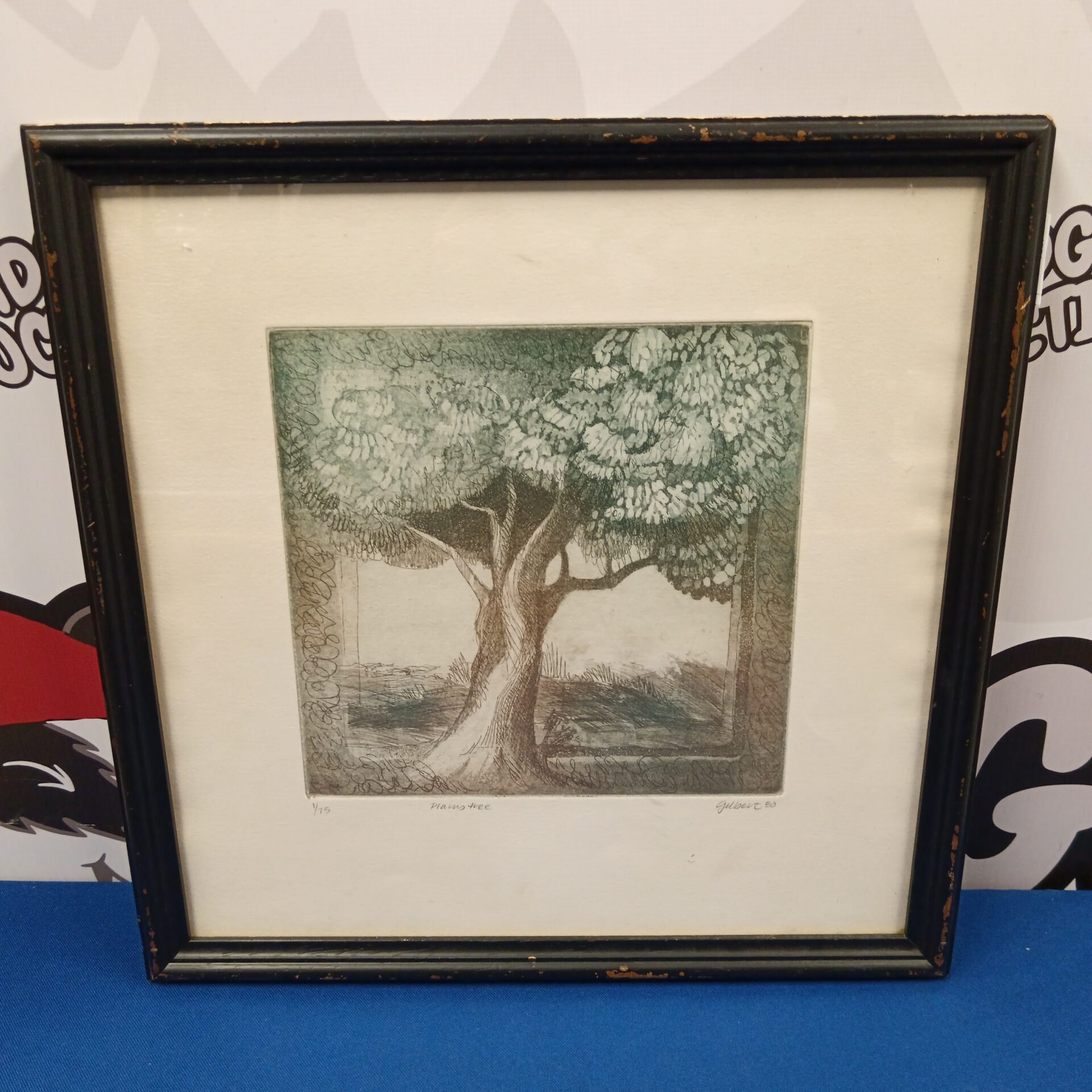This is a limited edition etching by Gilbert, titled “The Plains Tree”. The artwork depicts a solitary tree in a landscape setting, rendered with fine detail and tonal variation characteristic of the etching process. The piece is signed by the artist, adding to its collectibility and value. It’s a beautiful example of landscape art, showcasing Gilbert’s skill in capturing the essence of the natural world.