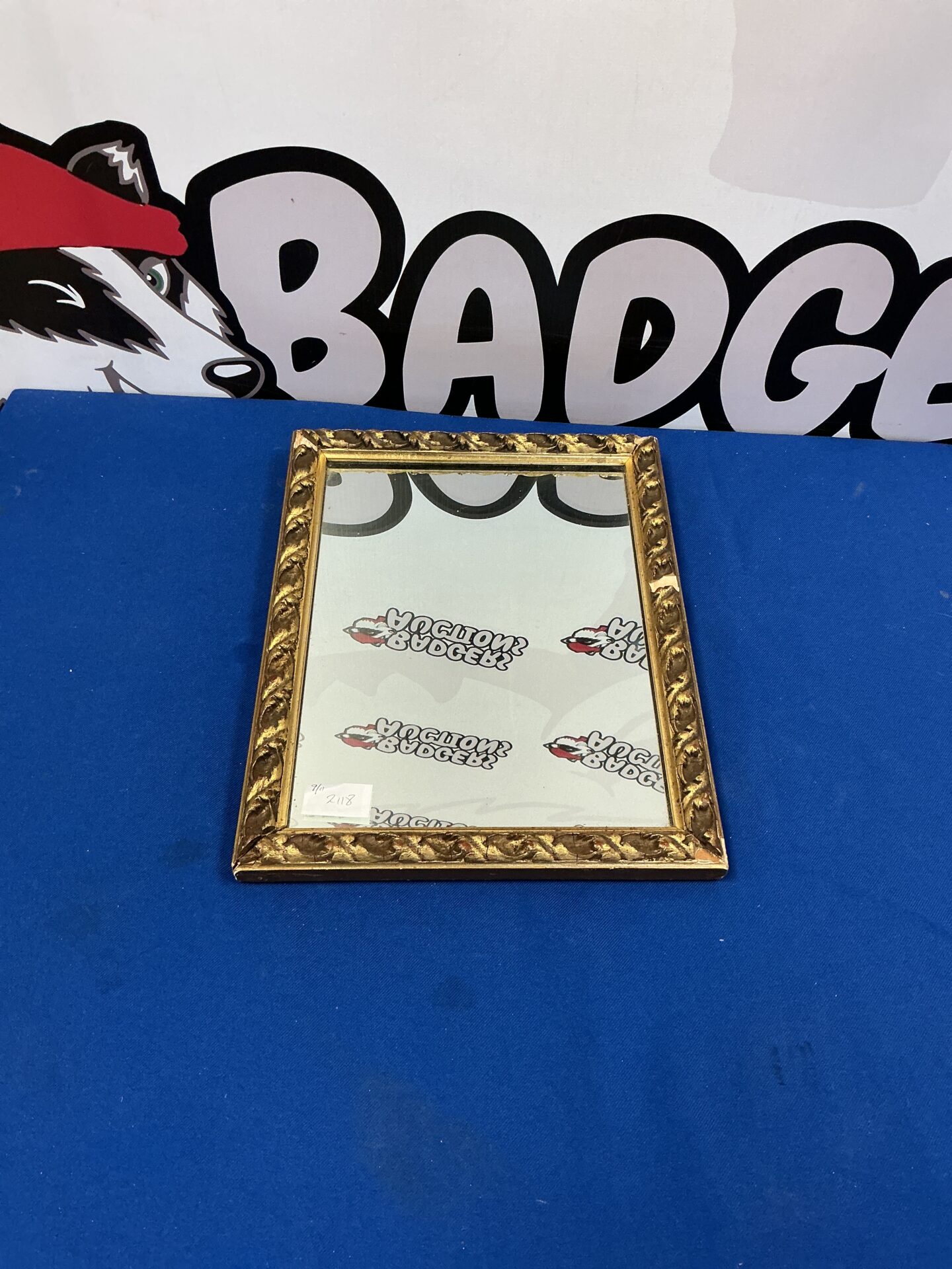 This is a decorative gilt framed mirror, measuring 14” x 9”. The frame exhibits a classic style, suggesting a period aesthetic. The mirror itself is likely glass, intended to reflect light and enhance a space.