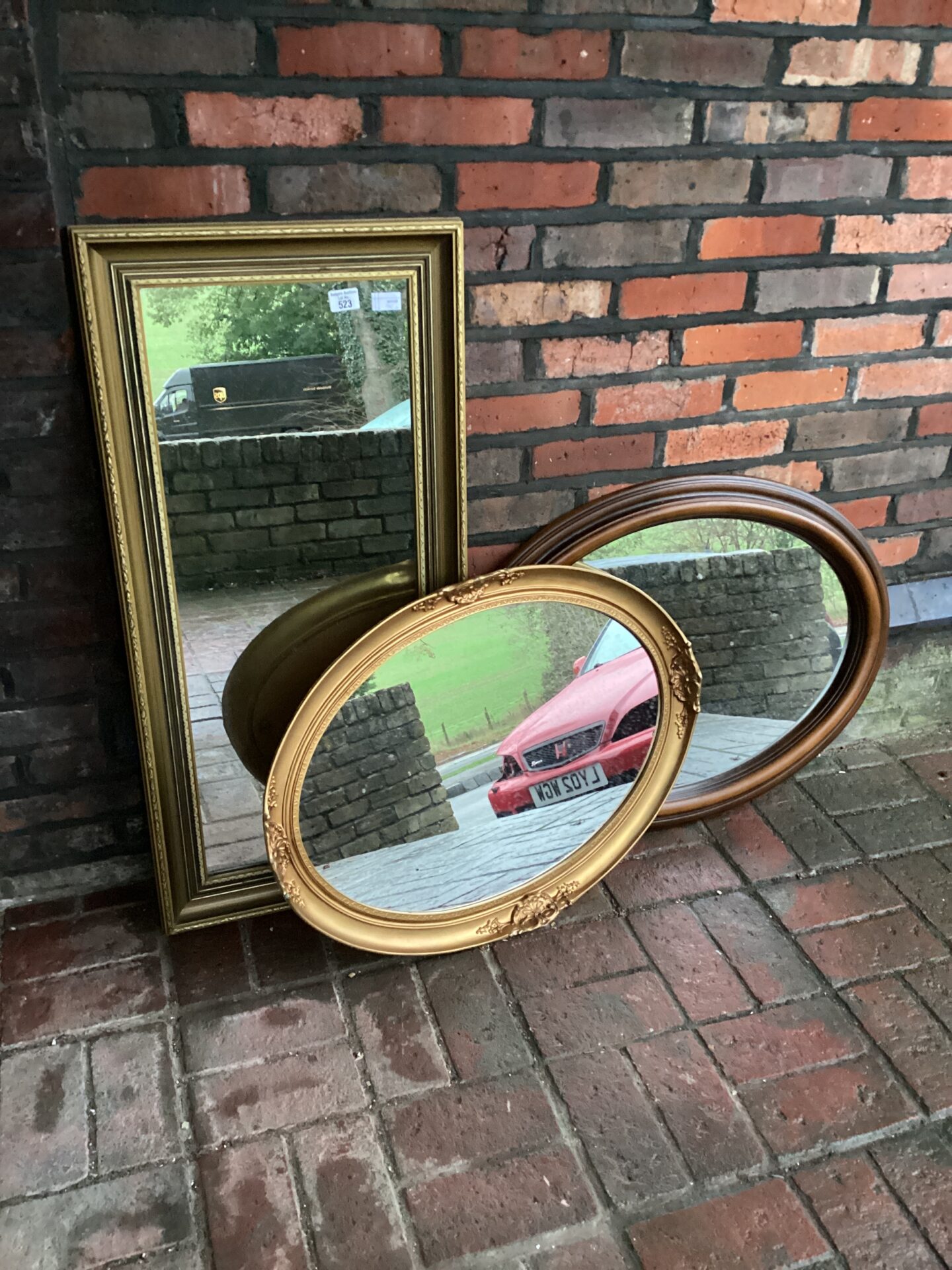 This lot comprises three mirrors, including two with ornate gilt frames and two oval mirrors. The frames exhibit a classic style, suggesting a period aesthetic. The mirrors themselves are likely intended for decorative purposes, adding a touch of elegance to a room.