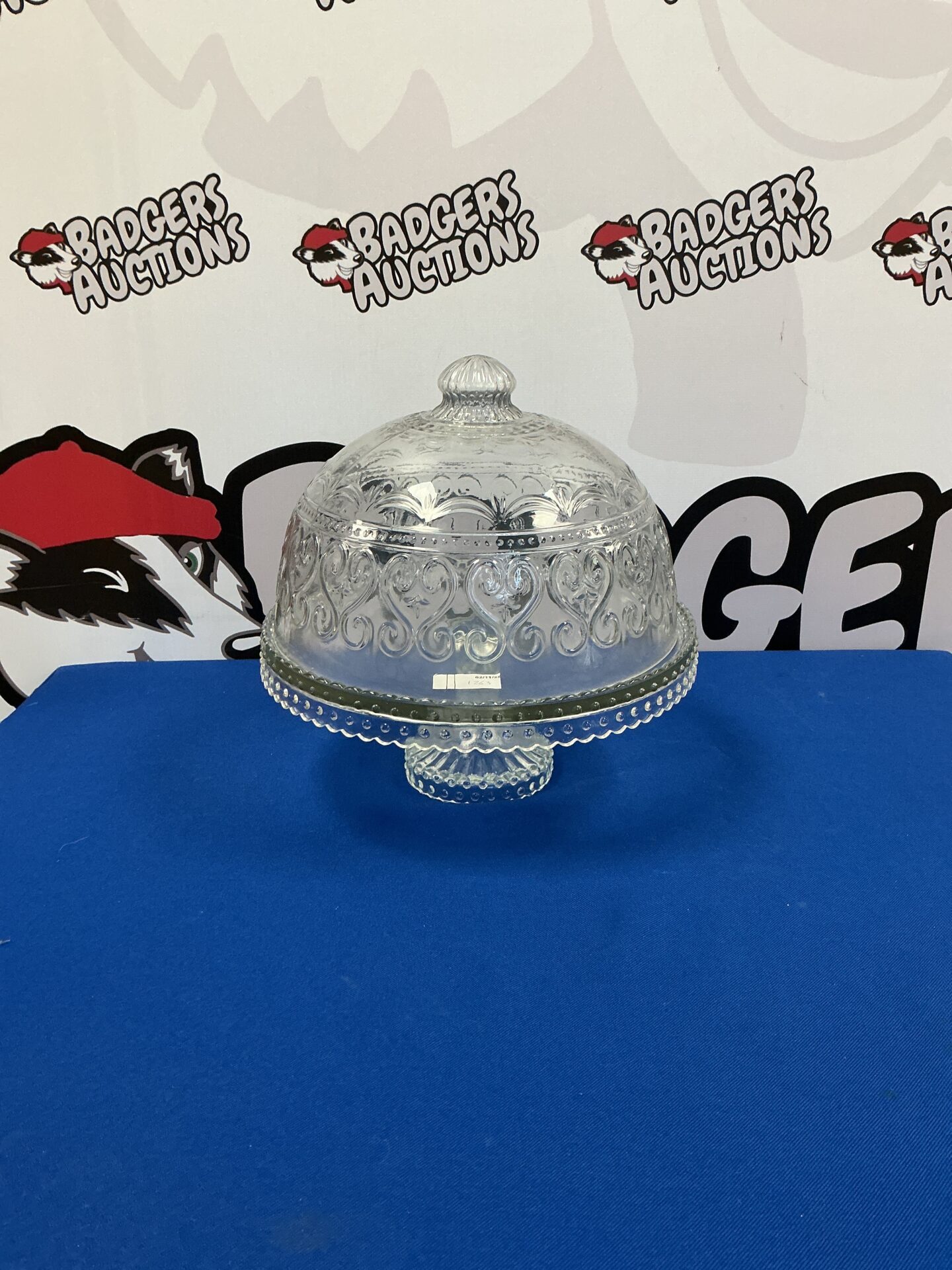 This is a beautiful glass cake stand, complete with a matching dome cover. The stand features a classic, slightly raised circular base, supporting a clear glass plate perfect for displaying cakes, pastries, or other desserts. The dome cover adds a touch of elegance and helps to keep the contents fresh, while also protecting them from dust. The stand’s design evokes a Victorian aesthetic, making it a charming addition to any dining table or display.