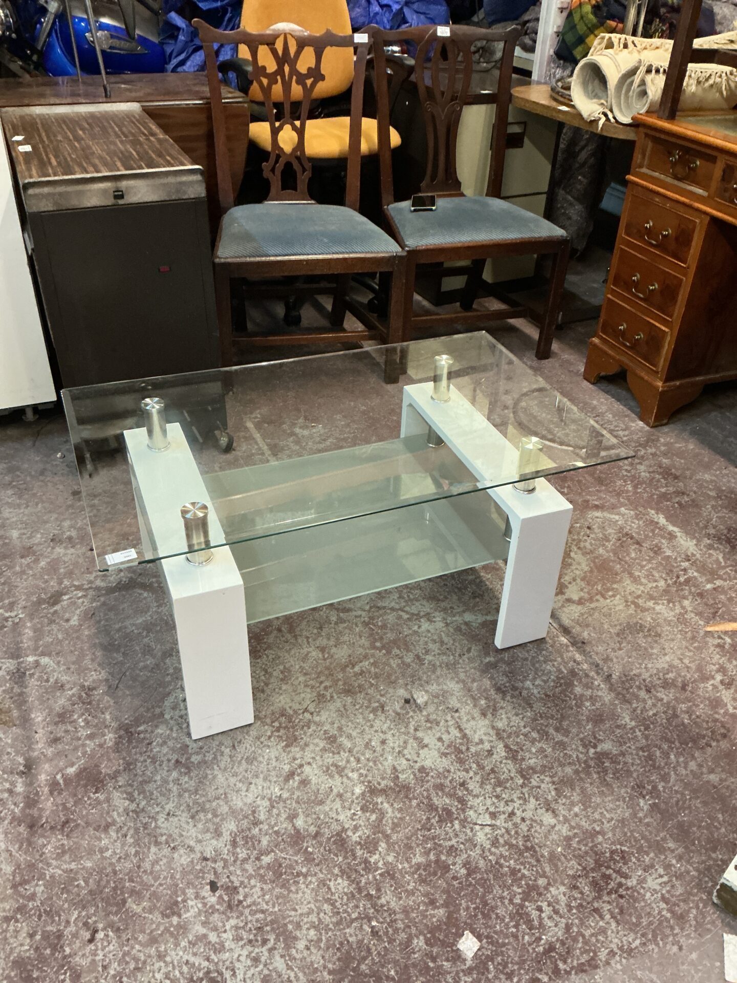 This coffee table shows signs of previous use and may benefit from cleaning. The glass top is intact, but may exhibit minor scratches or blemishes consistent with age and handling. Despite these minor imperfections, the table remains structurally sound and presents a stylish option for those seeking a modern accent piece.