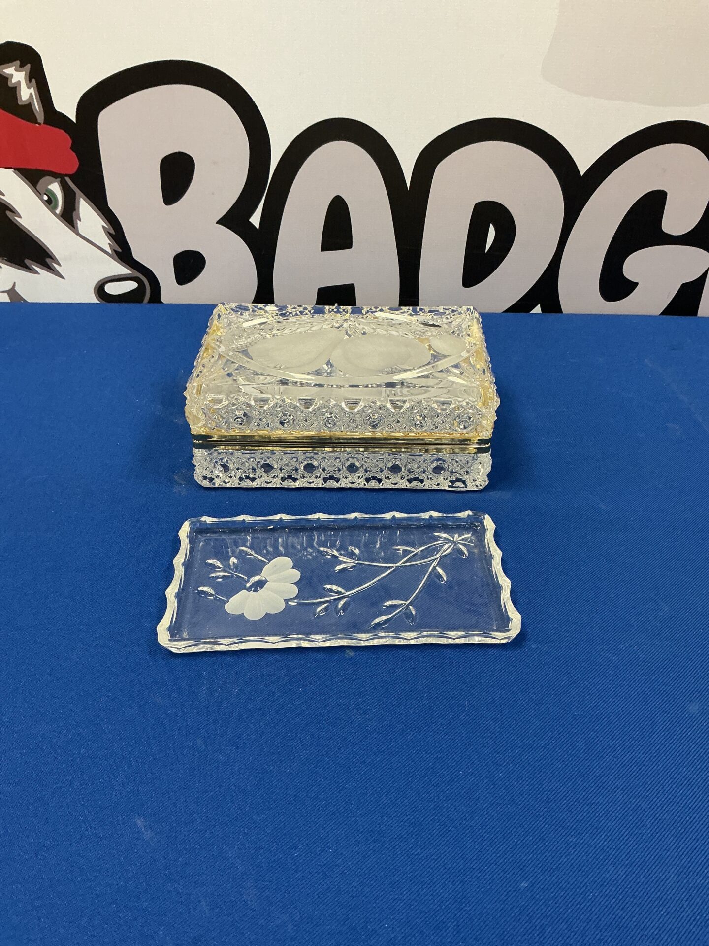 This jewellery box appears to be in good condition, with no obvious major damage. While showing signs of age and use, this adds to its vintage charm and character. Collectors of vintage glass or vanity items may find this box particularly appealing due to its decorative design and potential display value.