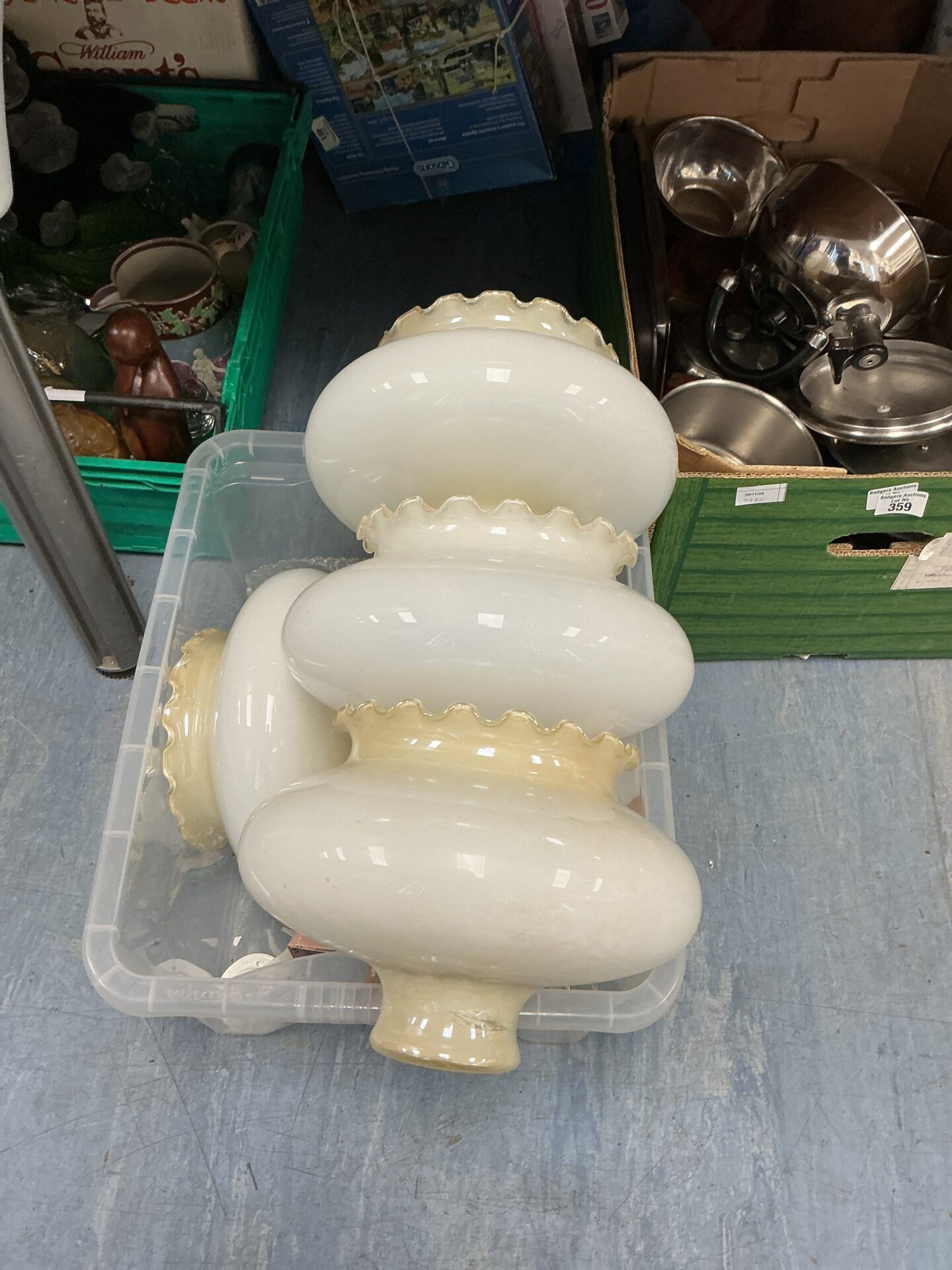 This lot comprises a quantity of glass lamp shades, appearing to be of a classic design. The shades are predominantly frosted glass, offering a soft diffusion of light. Their shape suggests they would be suitable for table lamps or smaller pendant fixtures, and their style is reminiscent of mid-century modern or art deco aesthetics.