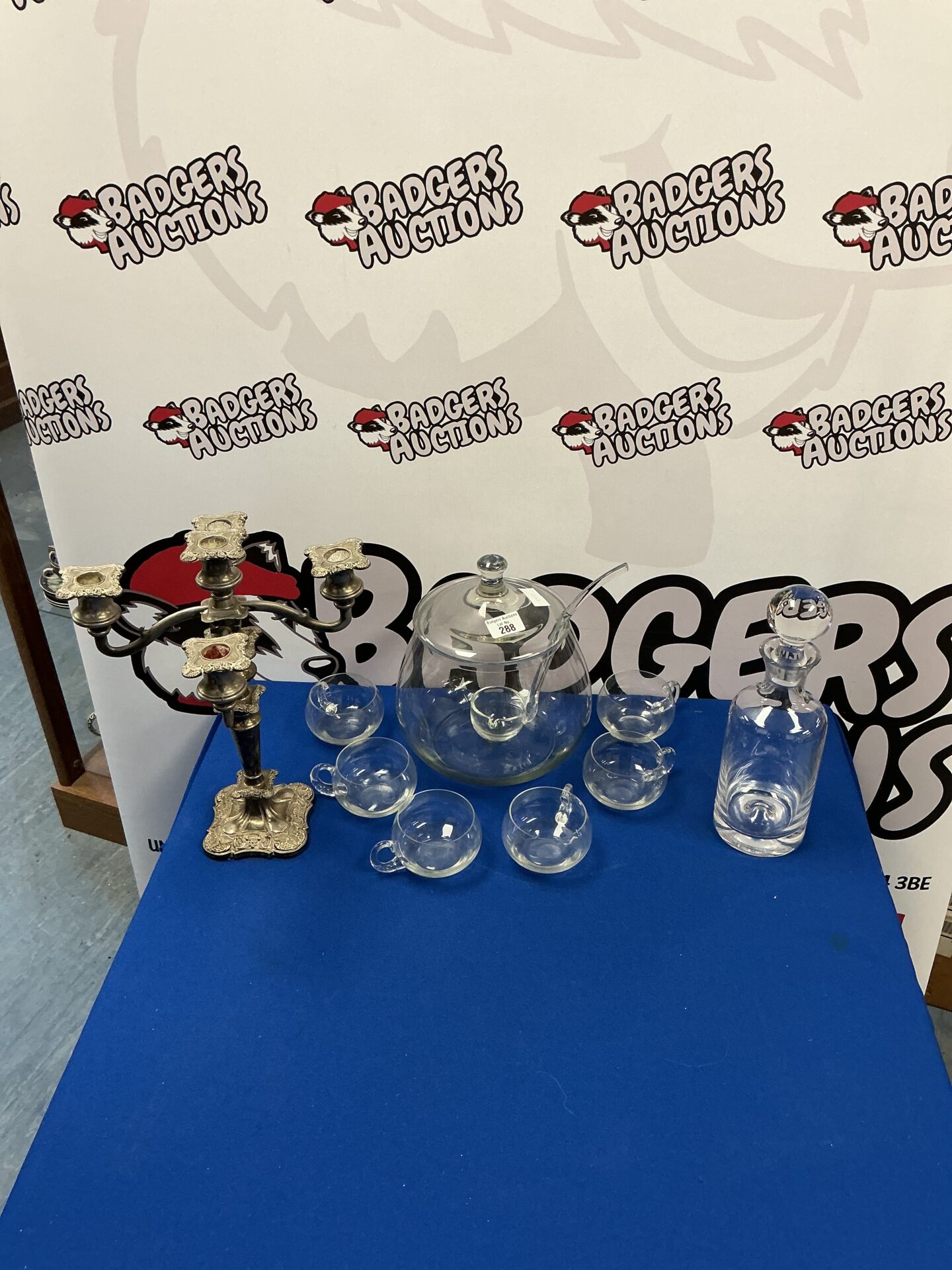 288 Glass Punch Bowl With Six Cups, Glass Decanter And Candle Stick Centre Piece