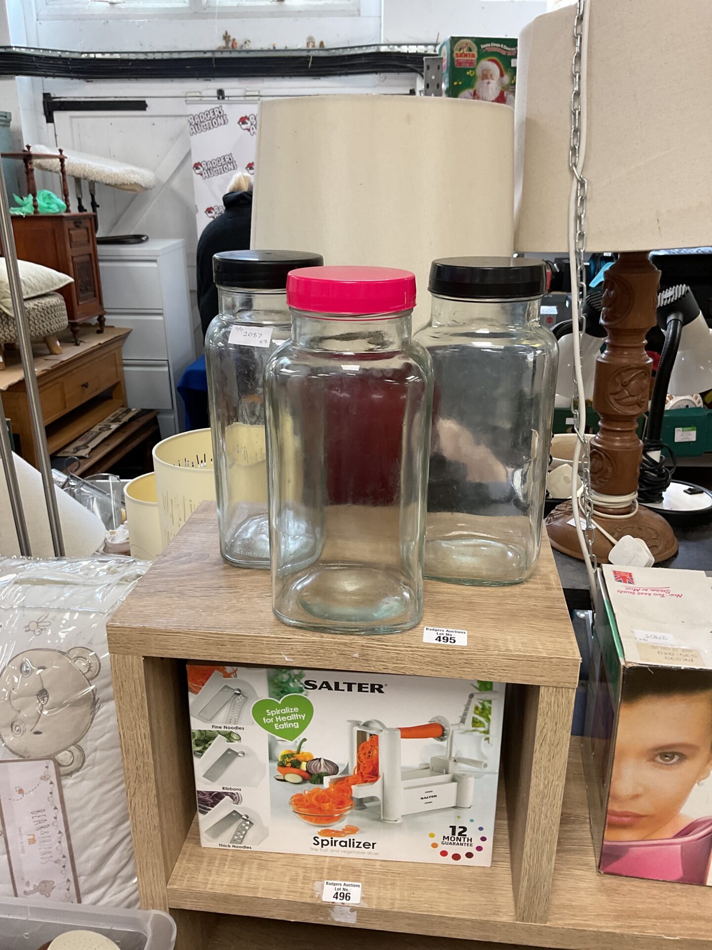This lot comprises three clear glass storage jars, ideal for pantry or kitchen use. The jars feature a wide mouth for easy access and a secure lid to maintain freshness. Their simple, classic design makes them versatile for storing a variety of dry goods, ingredients, or homemade preserves.