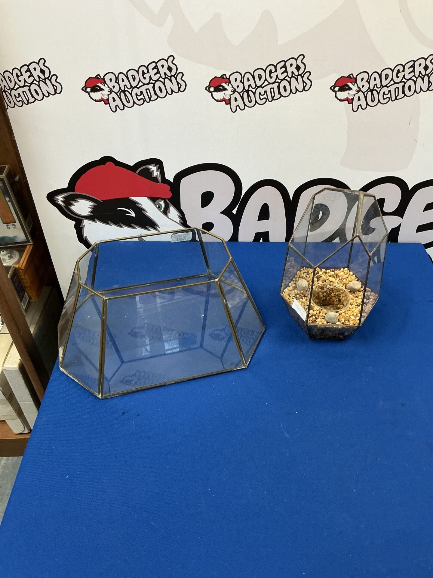 This lot features two geometric glass terrariums, ideal for displaying small plants, air plants, or decorative items. The terrariums have a faceted design, creating an interesting visual effect. These pieces would suit a variety of interior styles, from modern to bohemian.