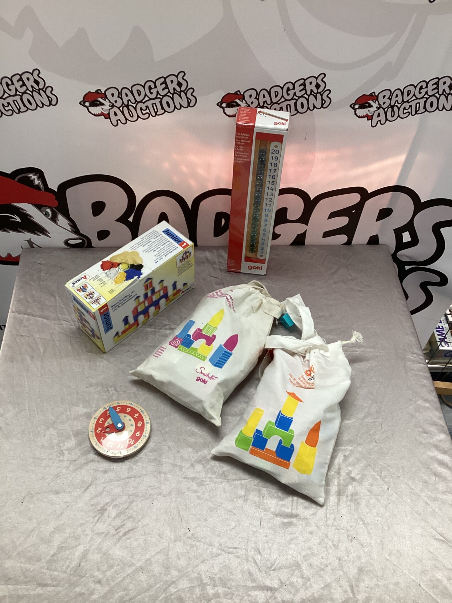 469 Two Bags Of Goki Childs Building Blocks, Goki Marble Calculator & Junior Set Of Stone Building Blocks