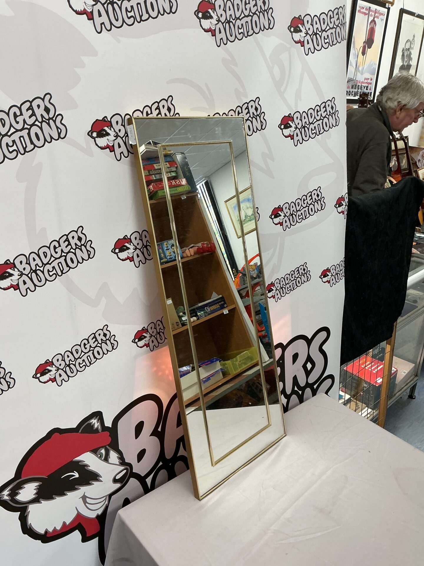 This mirror appears to be in good vintage condition, with only minor wear consistent with age. The gold frame retains its luster, and the mirror surface is free from significant scratches or blemishes. This piece would be a welcome addition to a collection of vintage home decor items, or a stylish accent for any home.