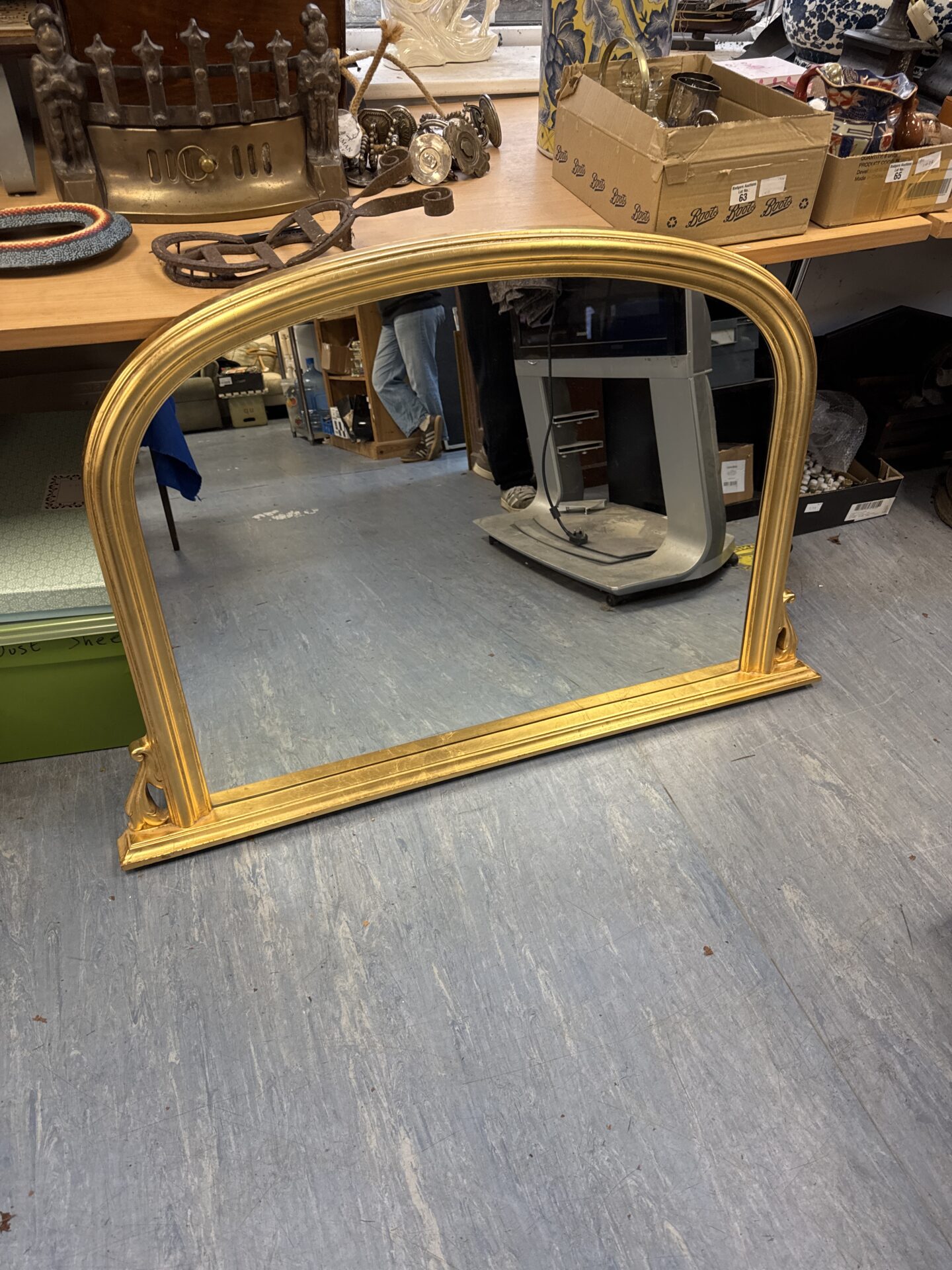 This impressive overmantle mirror features a beautifully ornate gold-painted frame, designed to be displayed above a fireplace mantel. Measuring 47 inches in width, this mirror is a statement piece, perfect for adding a touch of grandeur and elegance to any room. The intricate detailing and generous size make it a focal point, reflecting light and creating a sense of spaciousness.