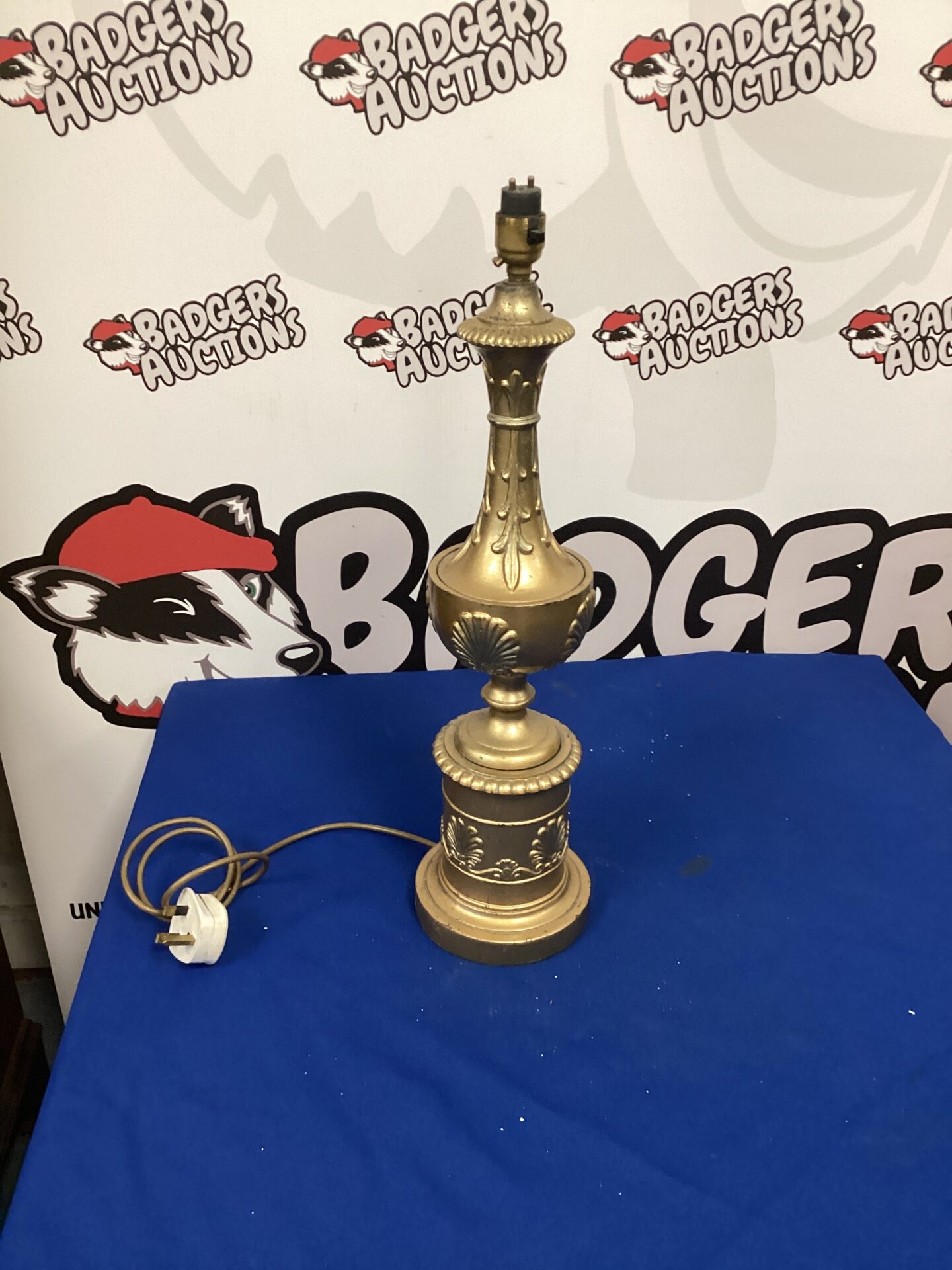 This elegant gold effect table lamp adds a touch of vintage sophistication to any room. Featuring a beautifully sculpted design and tiered base, it’s perfect for bedside tables or living room side tables. In good working condition, this lamp is a stylish and functional addition to any home.