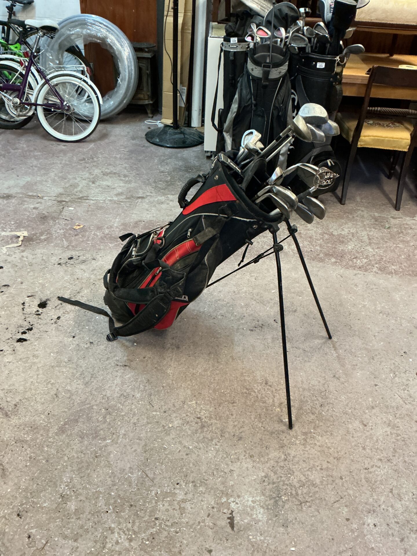 The clubs and bag exhibit signs of use and wear, consistent with a pre-owned sporting item. While the clubs are not new, they may appeal to a golfer seeking an affordable set or a collector of vintage sporting equipment. The set’s condition and brand could make it a desirable item for those interested in golf history or a budget-friendly option for beginners.