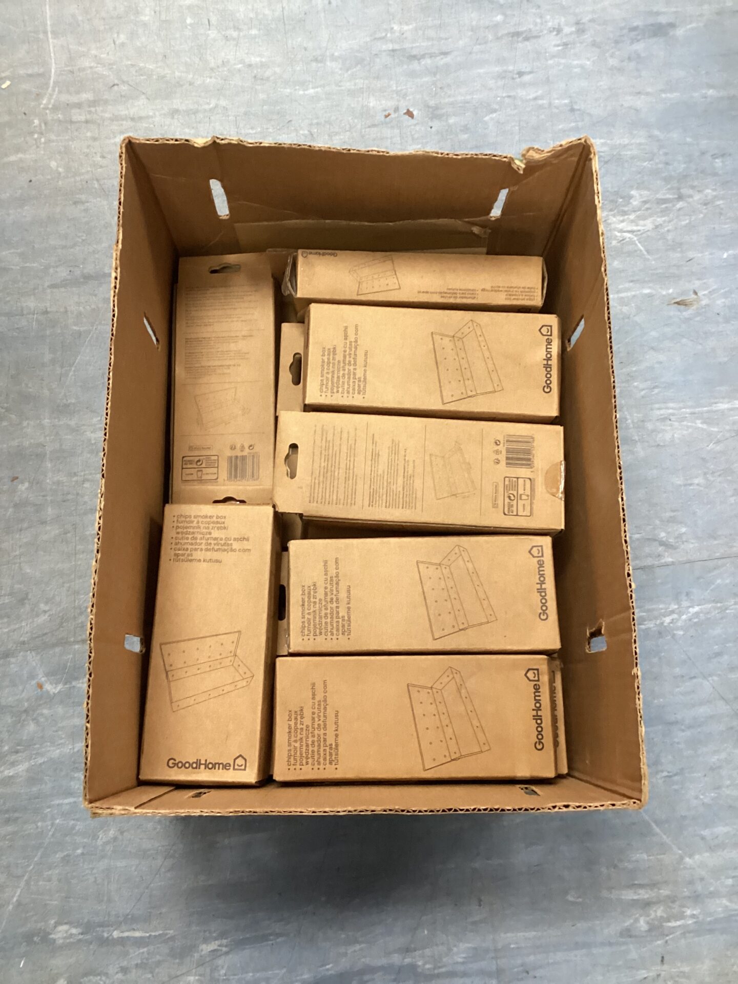 This lot consists of Goodhome chip smoker boxes, designed for use with barbecues and grills. These boxes are intended to hold wood chips, infusing food with a smoky flavour during cooking. The boxes appear to be constructed from cardboard, offering a disposable and convenient solution for adding smoky notes to outdoor meals.
