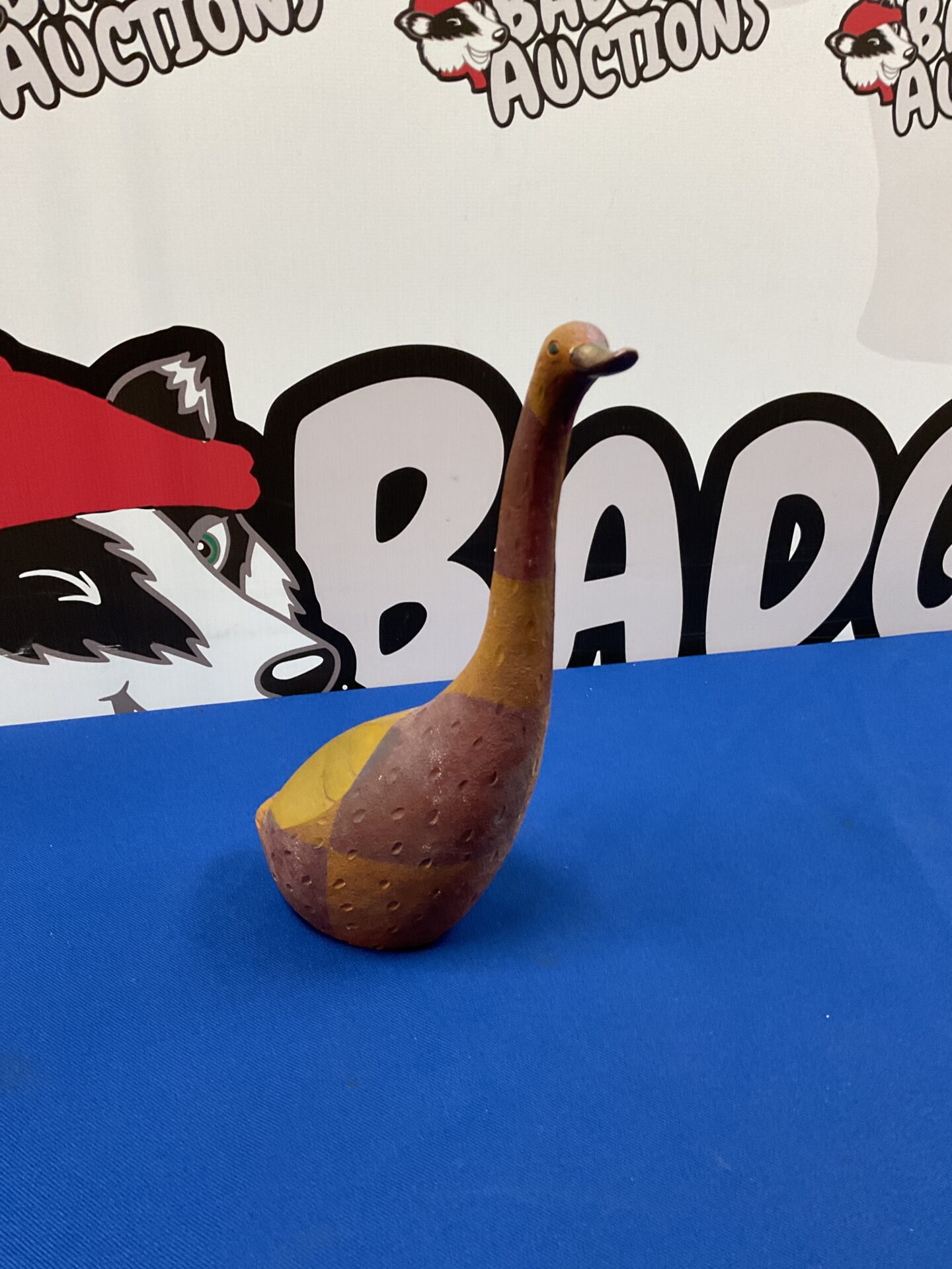 This goose ornament presents as presented, with signs consistent with age and previous display. It would appeal to collectors of animal figurines, farmyard memorabilia, or those seeking a quirky and characterful garden ornament. Its resin construction ensures it is relatively lightweight and suitable for various display locations.