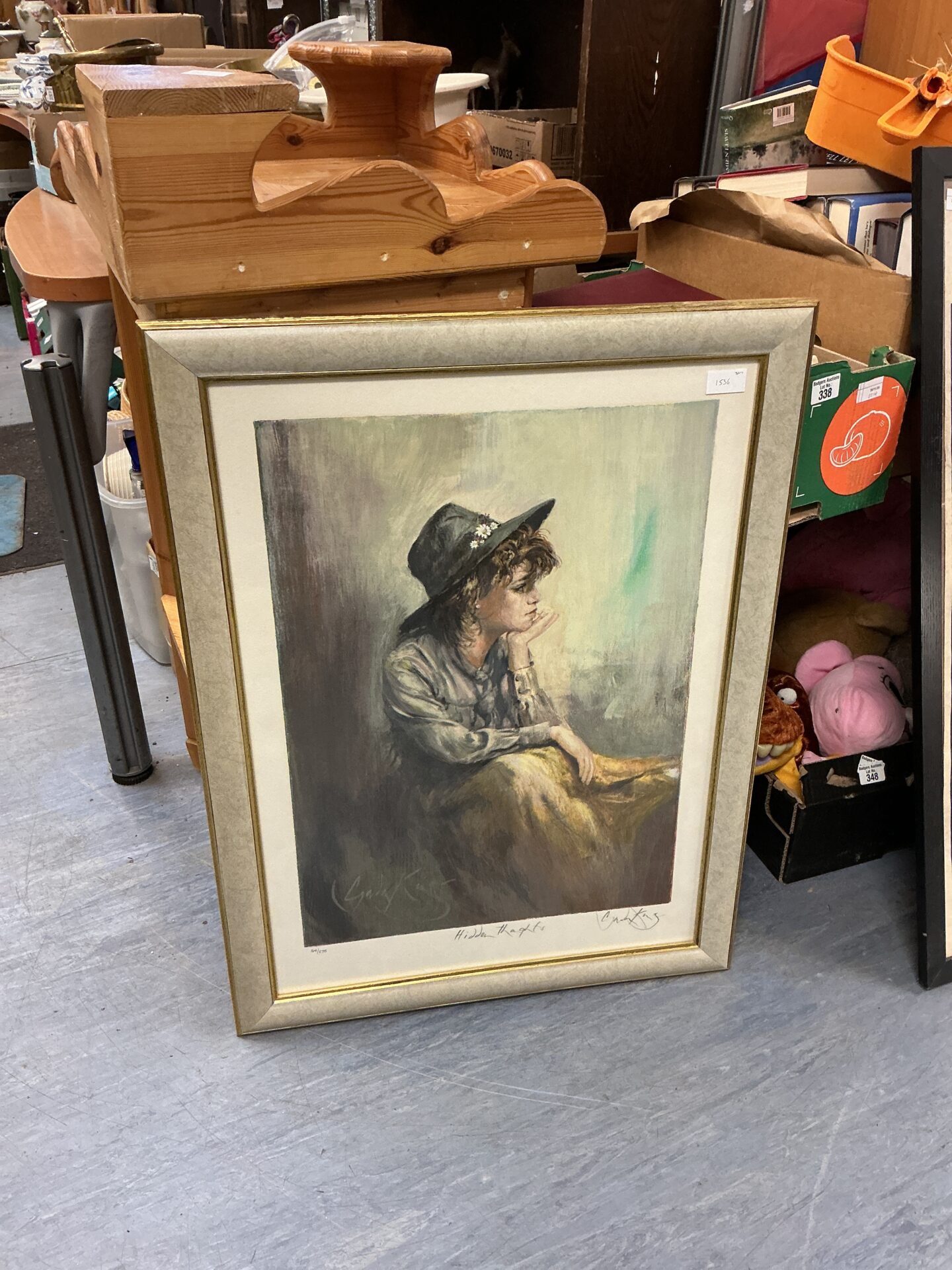 This is a limited edition print titled “Hidden Thoughts” by artist Gordon King. The artwork depicts a young girl in a contemplative pose, rendered in a detailed and expressive style. The print is professionally framed, enhancing its visual appeal and making it ready for display. It’s a striking piece that captures a moment of quiet introspection.