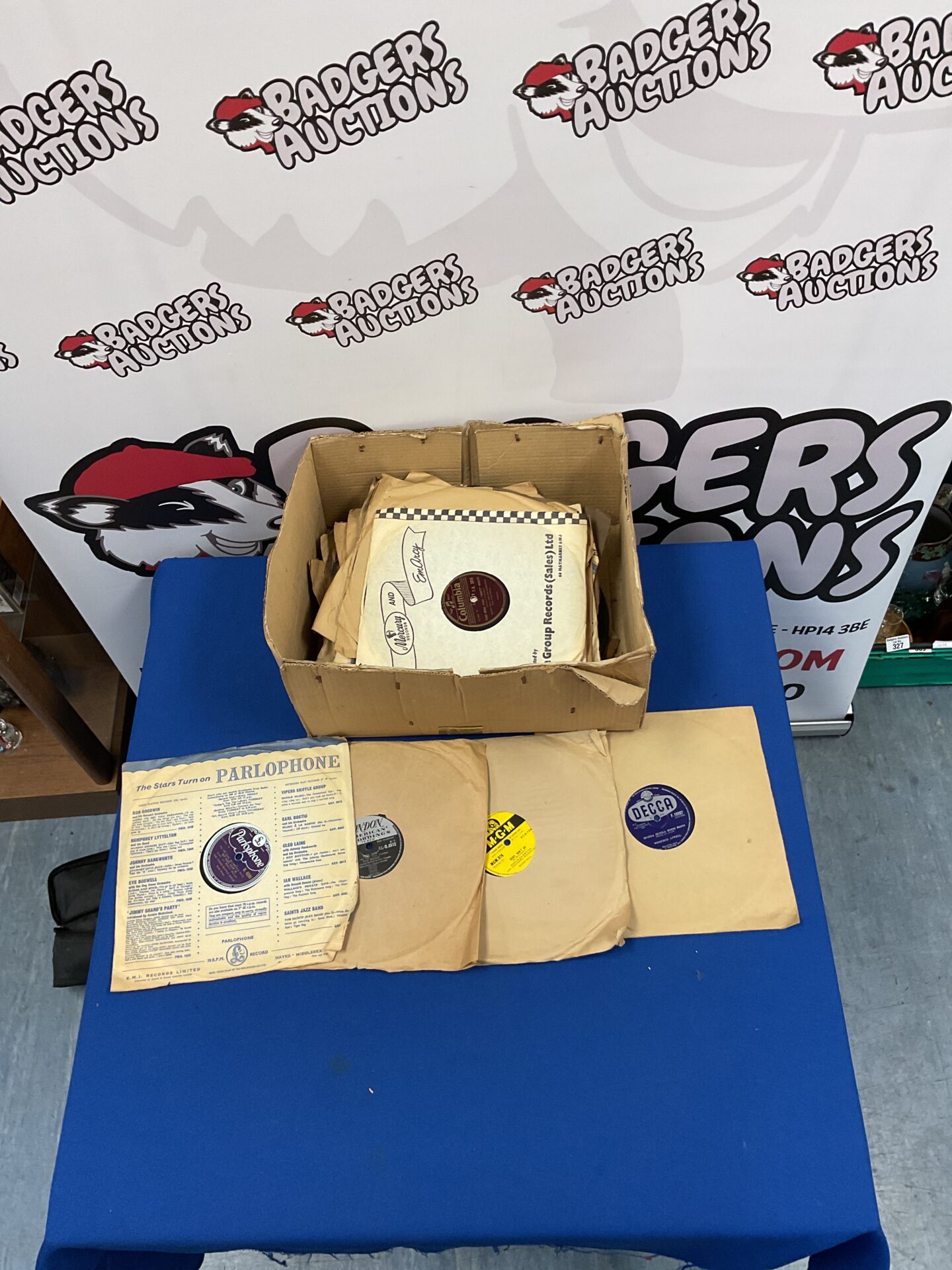 This lot comprises a collection of gramophone records, likely dating from the early to mid 20th century. The records appear to be the 78 RPM variety, commonly used on vintage gramophones and record players. The collection offers a glimpse into the musical tastes of a bygone era, and may include a variety of genres and artists.