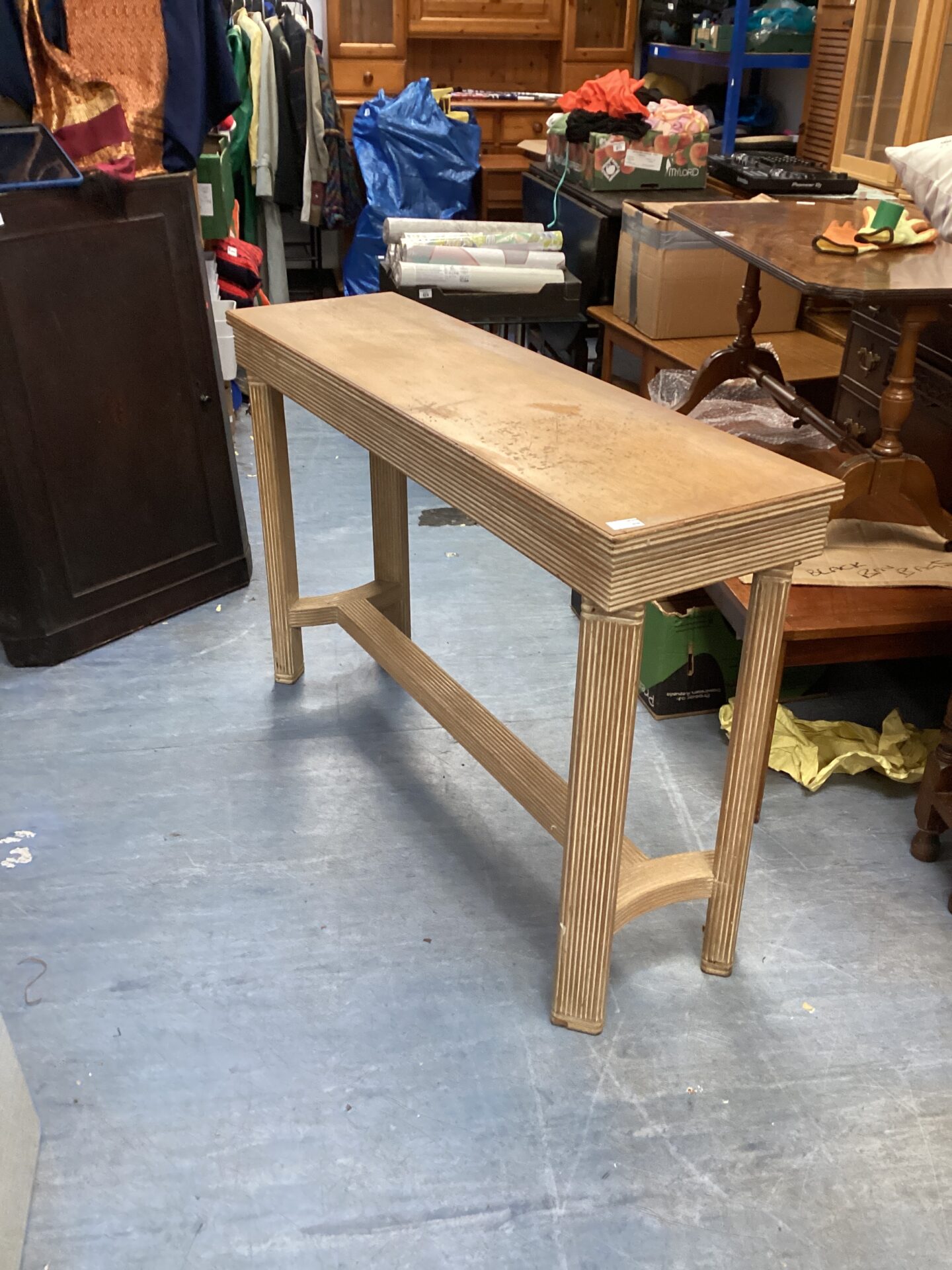 This console table exhibits characteristics of the Grecken style, popular in the mid-20th century. The table features a simple, streamlined design with gently curved legs and a rectangular top. It would have originally served as a functional and stylish addition to an entryway or hallway, providing a surface for displaying decorative items or holding everyday essentials. The construction appears to be solid wood, suggesting durability and quality craftsmanship.