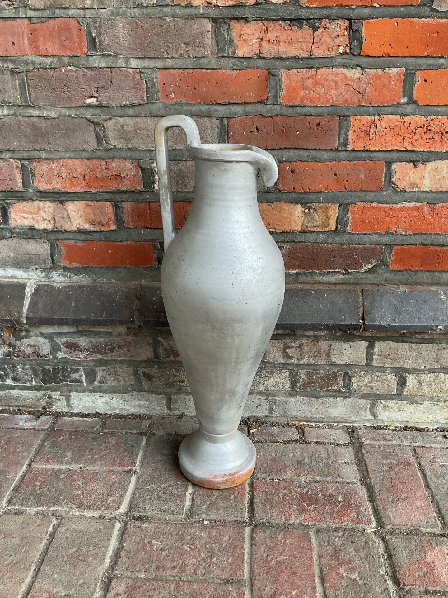 This impressive ewer is crafted in the style of ancient Greek pottery, standing at 26 inches tall. The terracotta vessel features a classic form, reminiscent of amphorae used for storing and transporting liquids. Its substantial size and elegant silhouette make it a striking decorative piece, ideal for display or as a statement piece in a collection.