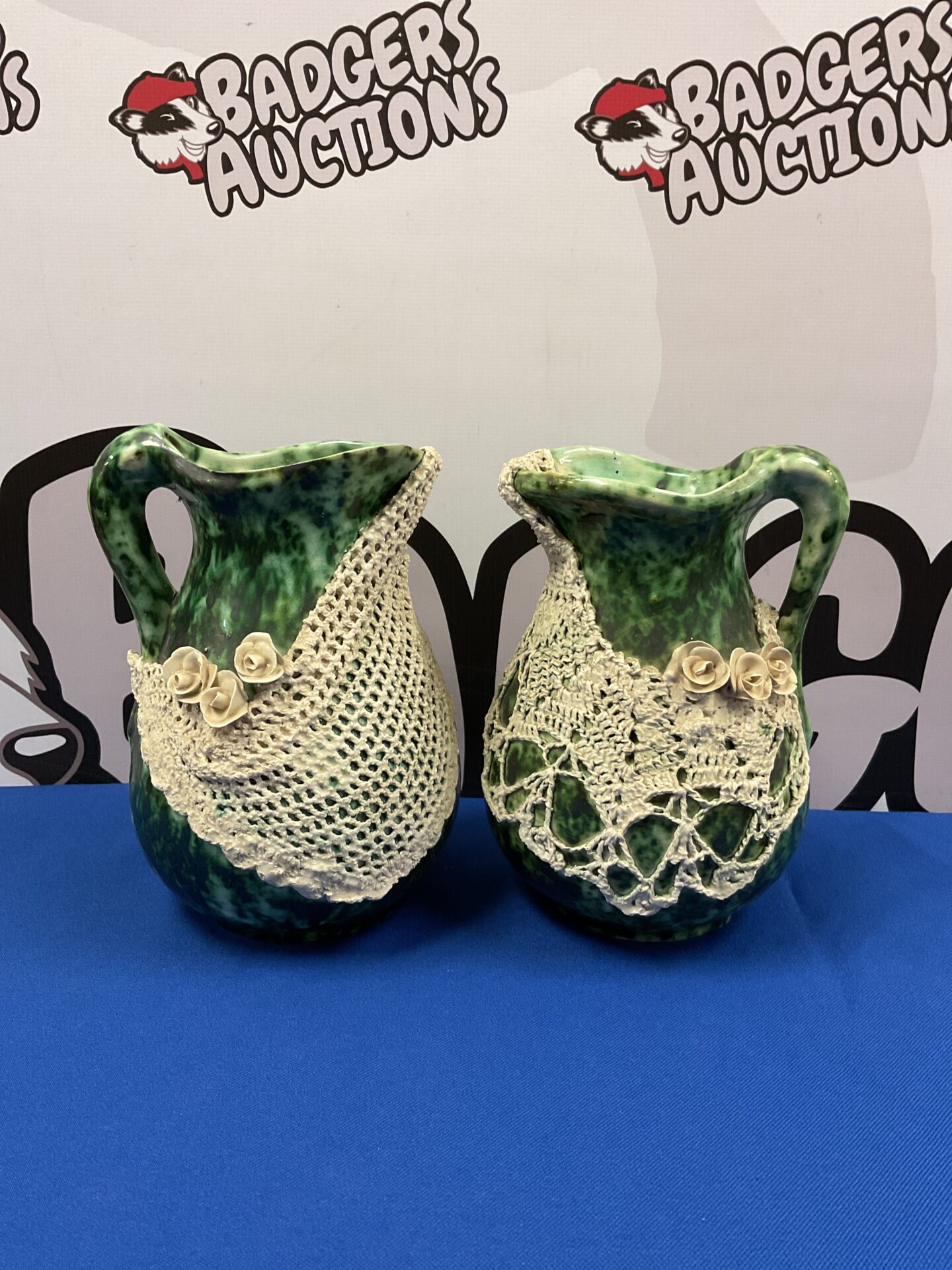 This pair of ceramic jugs features a vibrant green glaze and a raised design resembling a fishing net. The jugs are beautifully crafted, showcasing a classic country kitchen aesthetic. The detail in the net design adds a charming, nautical touch, making them ideal for display or decorative use.