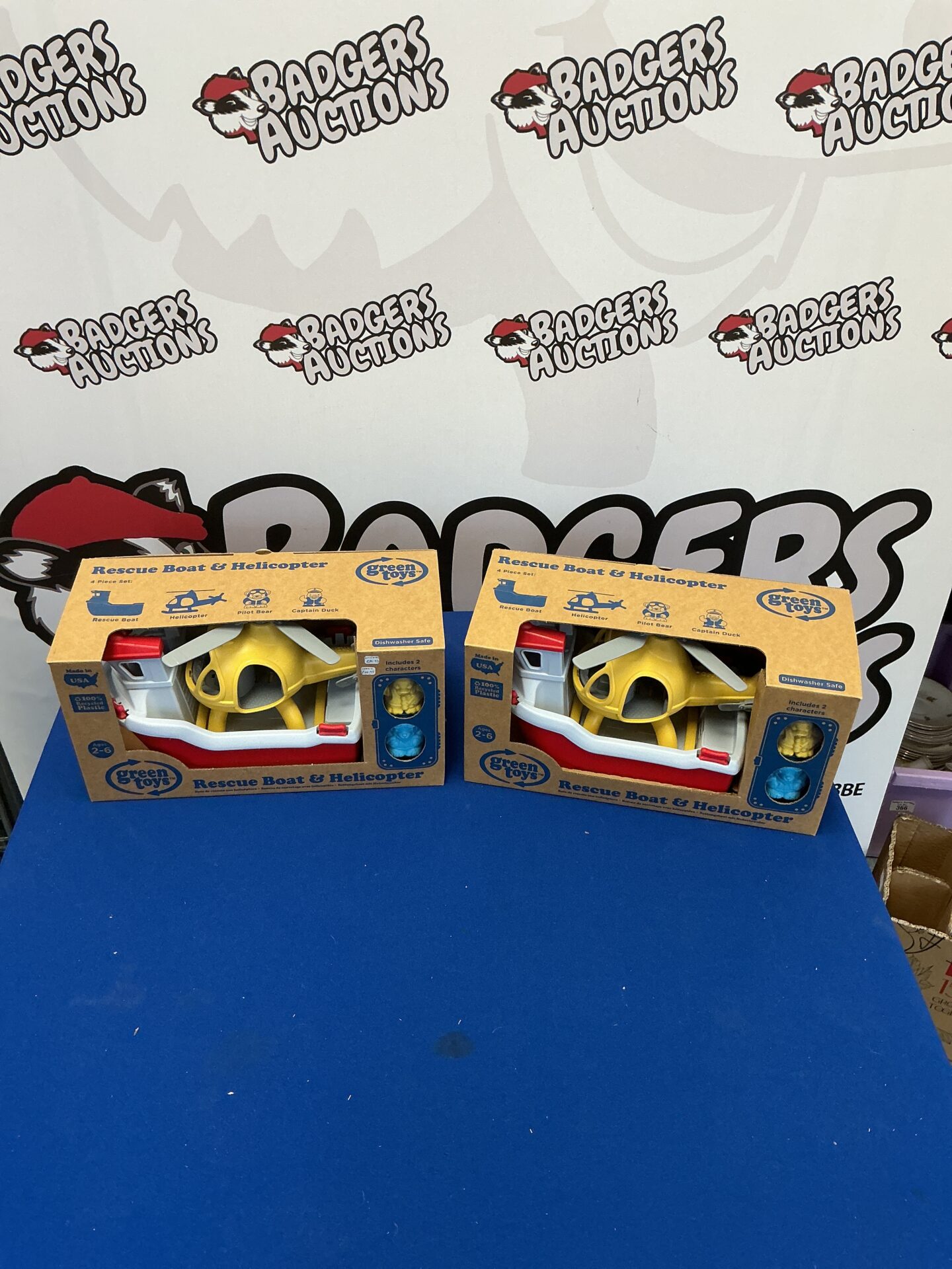This lot features two Green Toys rescue vehicles: a boat and a helicopter. Crafted from 100% recycled plastic milk jugs, these toys are designed for safe and sustainable play. The boat and helicopter both feature simple, chunky designs, ideal for small hands, and are intended for bath time or water play. They are brightly coloured and promote imaginative role-playing scenarios.