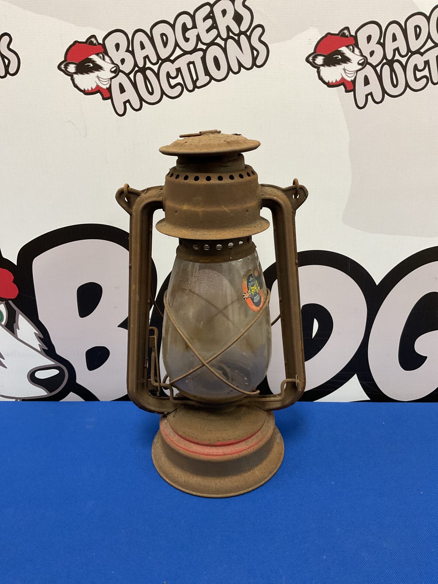 This lantern presents with signs consistent with age and use, offering a charming patina that adds to its character. While the lantern’s functionality is not assessed, it is presented as a collectible item for display or restoration. The lantern’s vintage appeal and classic design make it an attractive addition to any collection of antique lighting or camping memorabilia.