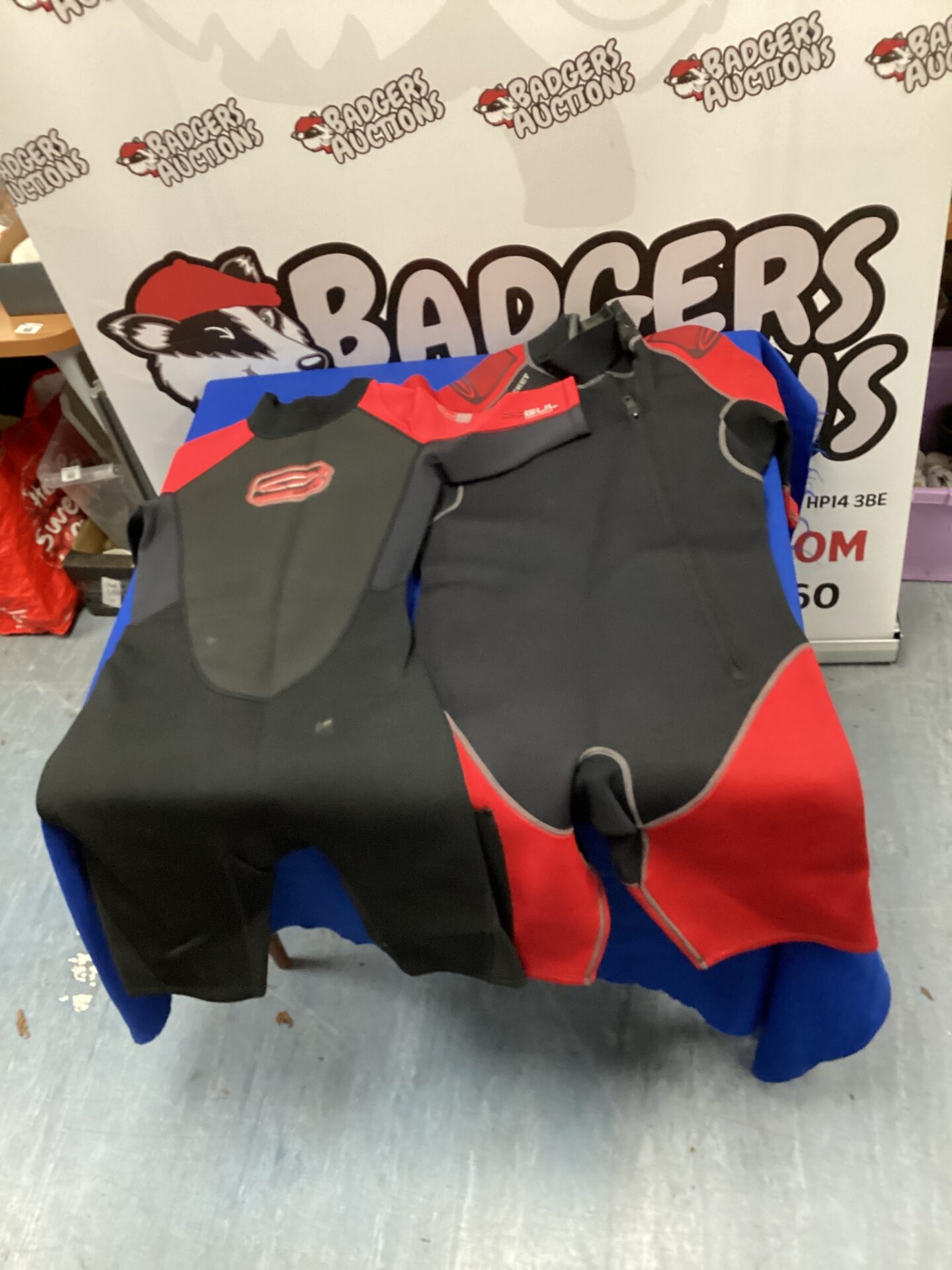 This lot comprises a pair of Gul wet suits, designed for both male and female watersports enthusiasts. The suits appear to be constructed from neoprene, offering thermal protection and flexibility. One suit is a larger size, likely a men’s L, while the other is a smaller size, likely a women’s S, creating a ‘his & hers’ pairing for coordinated use.