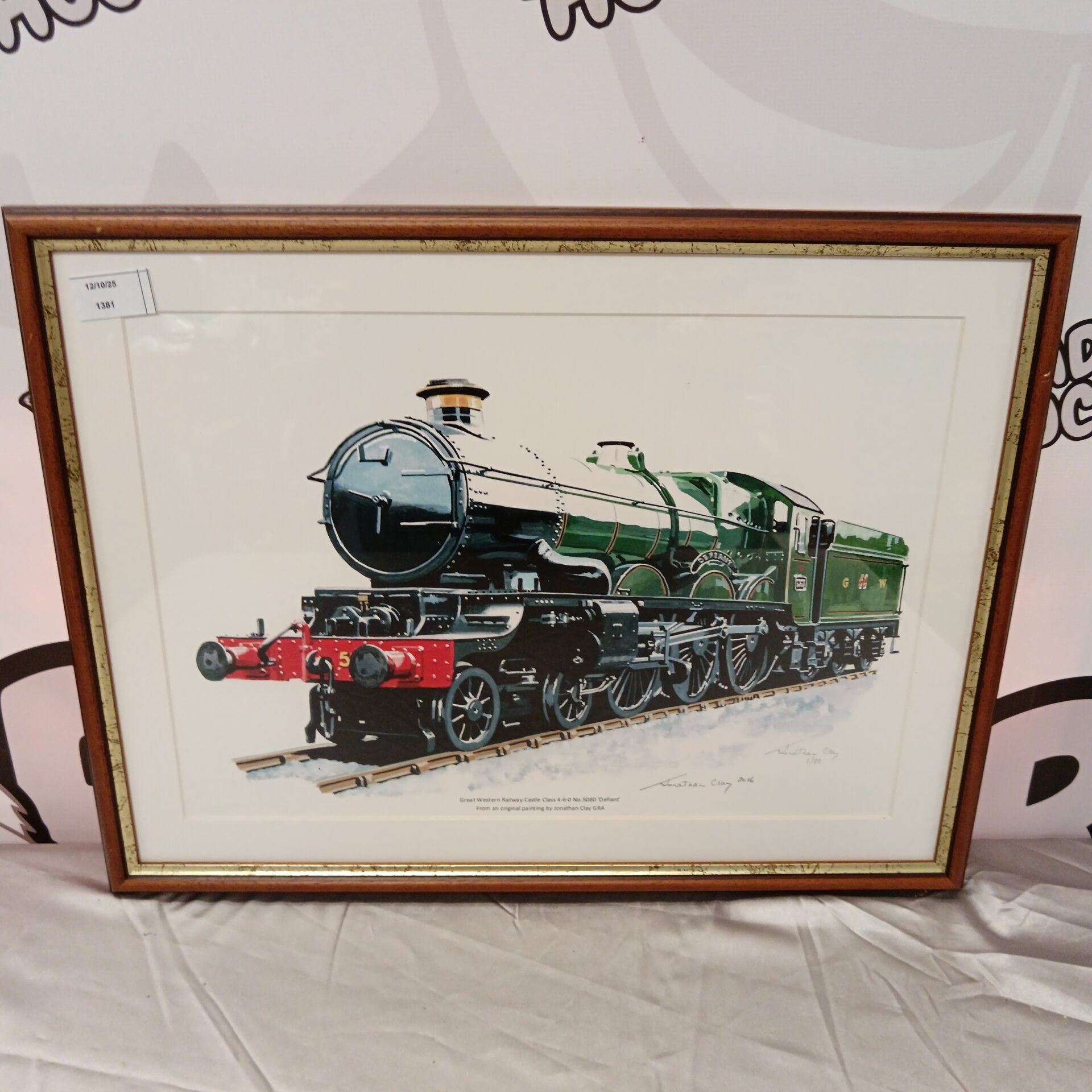 This is a stunning limited edition print by artist Jonathan Clay, depicting a GWR Castle Class steam train. Numbered 1/80, this print showcases Clay’s skill in capturing the power and majesty of these iconic locomotives. The artwork is beautifully detailed and would be a fantastic addition to any railway enthusiast’s collection.