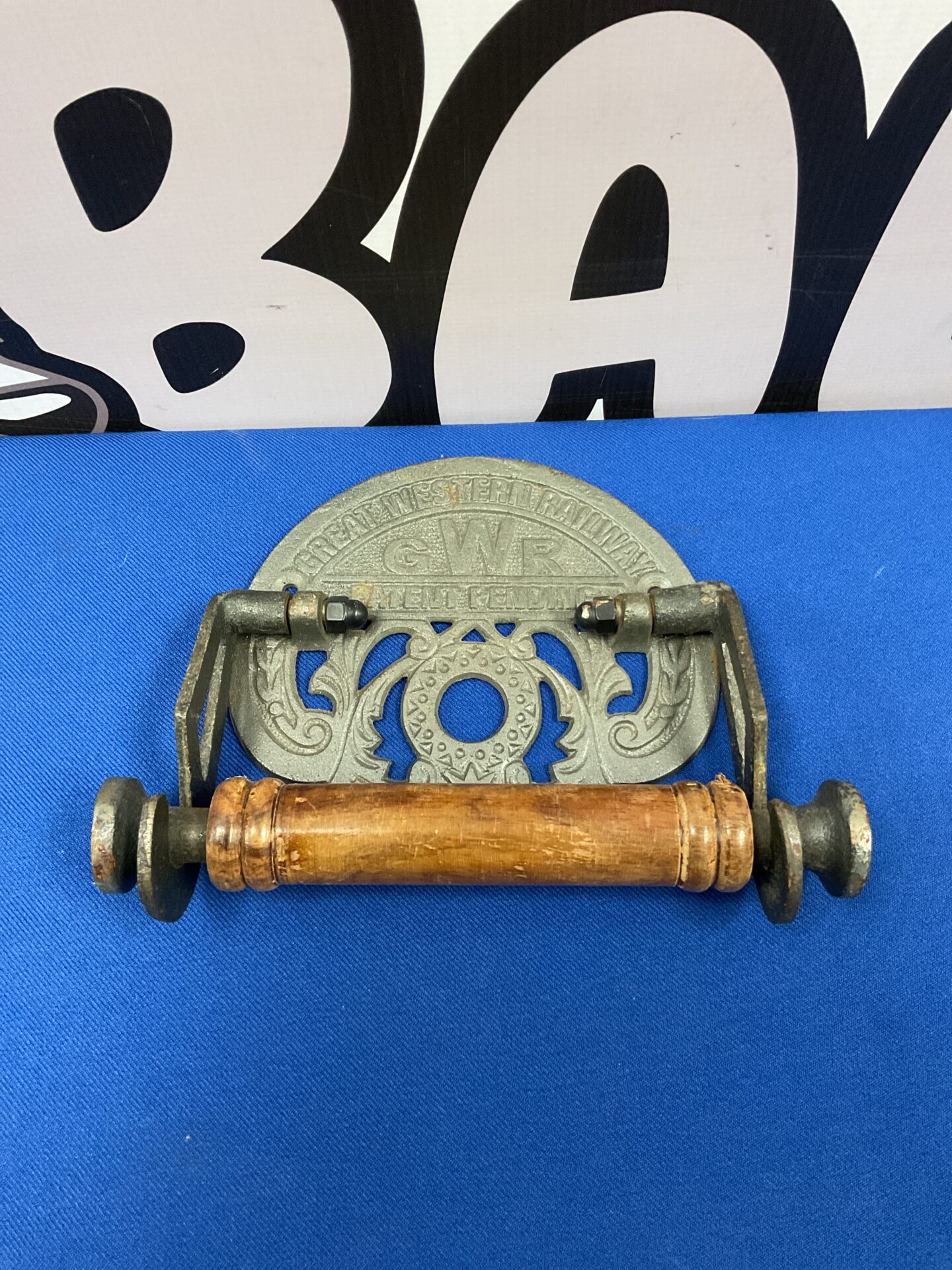 This is a cast iron loo roll holder, originating from the Great Western Railway (GWR). The holder features decorative detailing typical of the era, showcasing the GWR’s branding and aesthetic. It would have originally been fitted within a railway carriage or station restroom, offering a glimpse into the history of British rail travel.