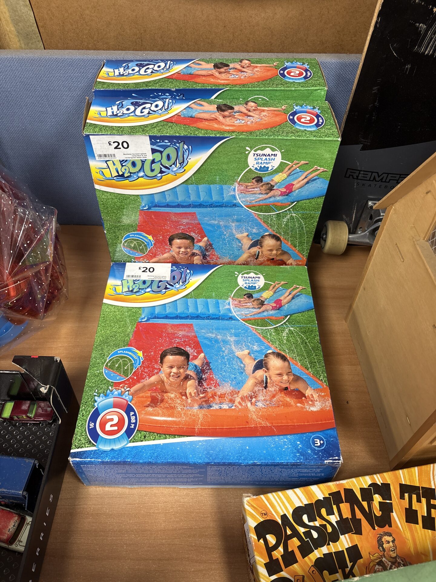 This lot features three new H20 Go Tsunami Splash Ramps, designed to bring exciting water play to any backyard or pool. These ramps are constructed from durable plastic, allowing for a smooth and safe sliding experience. The bright colours and playful design are sure to appeal to children, encouraging active outdoor play during warmer months.