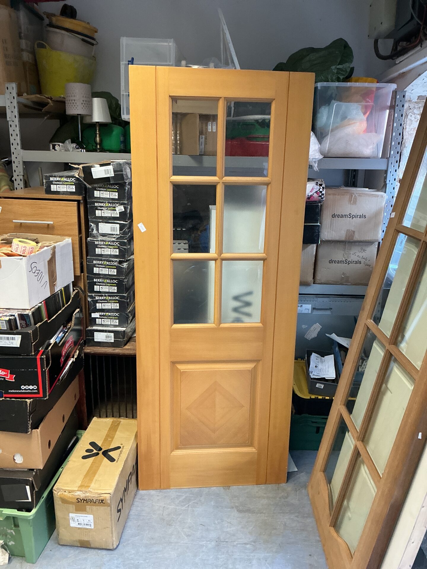 This is a salvaged half glass door, measuring 78 inches in height and 30 inches in width. The door features a classic design with a substantial wood frame and a large glass pane, offering a blend of privacy and light transmission. It’s ideal for adding character to a home, potentially as a pantry door, room divider, or unique interior feature.