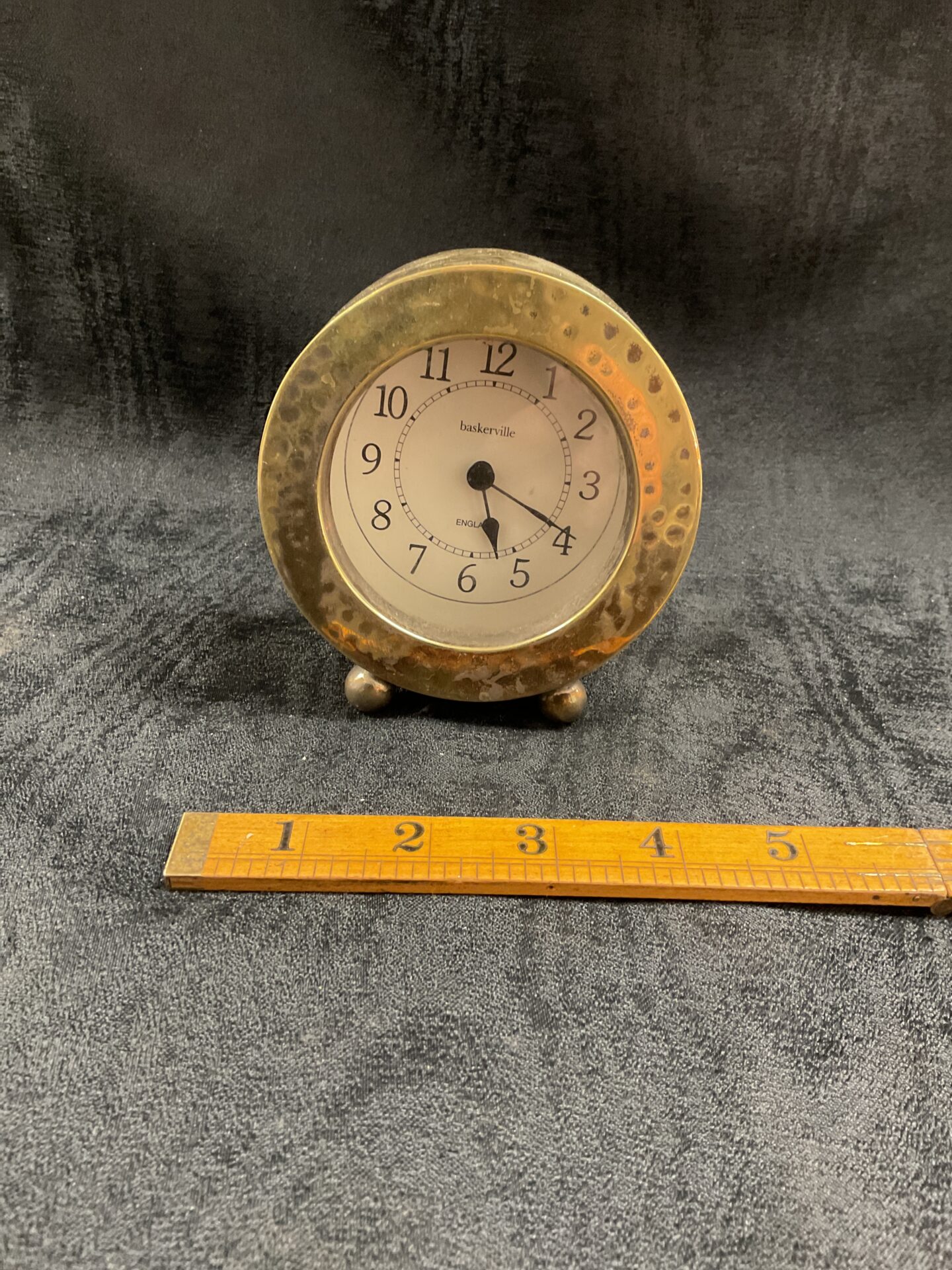 The clock is in good vintage condition, showing some signs of wear consistent with age and use, which adds to its character. It appears to be fully functional, though a new battery may be required. This piece would be of interest to collectors of vintage clocks, brassware, or those seeking a unique and stylish decorative item for their home.