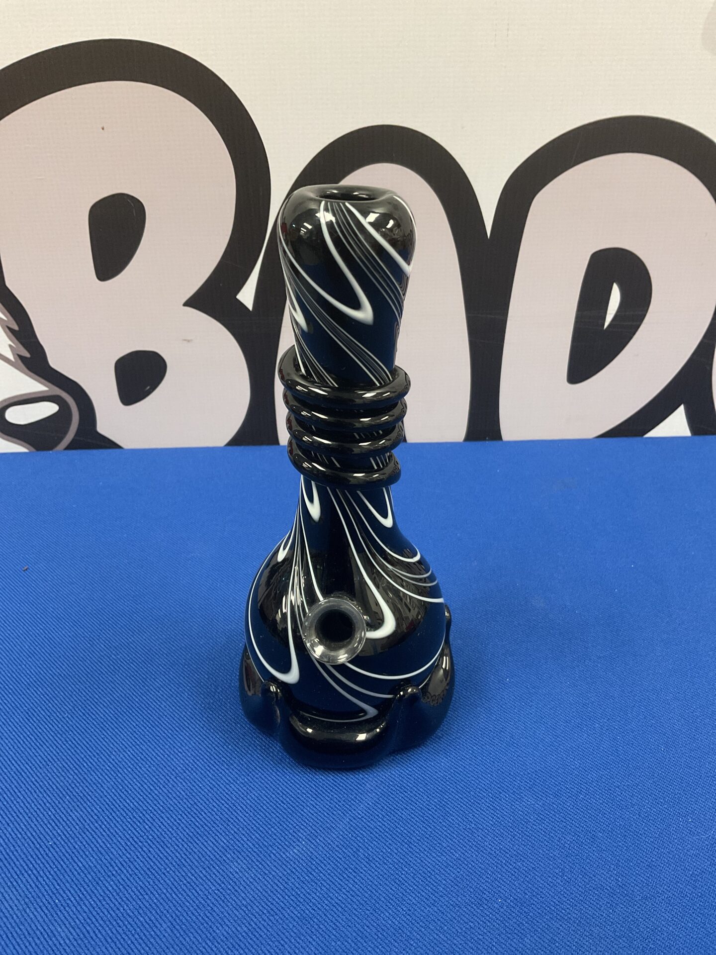 This striking 7” tall chillum pipe is a testament to the artistry of hand-blown glasswork. The pipe features a captivating swirl pattern in black and white, creating a visually dynamic and unique piece. The craftsmanship is evident in the smooth curves and delicate shaping, making it both a functional smoking accessory and a beautiful decorative object.