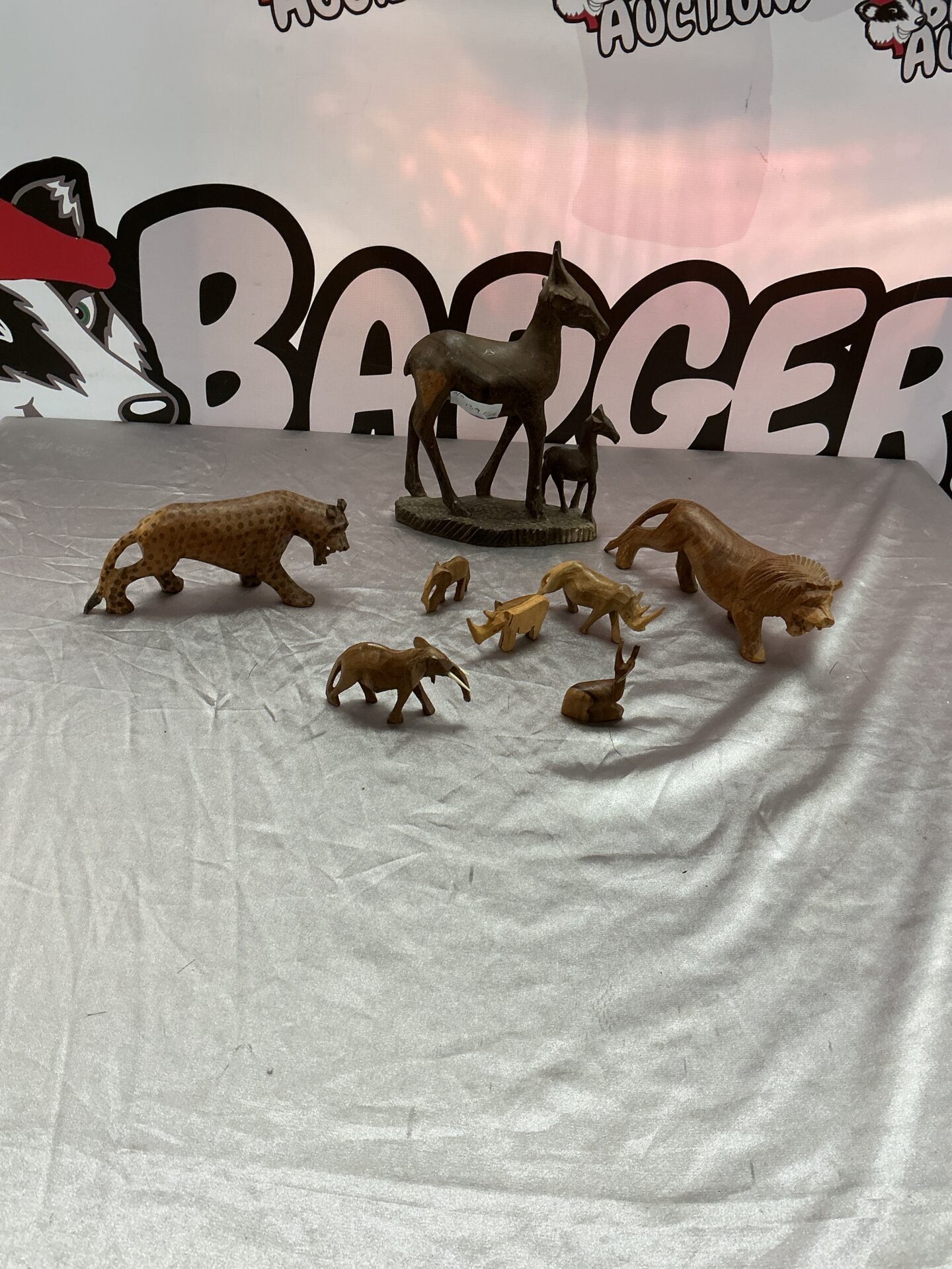This lot comprises a collection of charming hand-carved animal figures. Crafted from wood, these pieces showcase a naive, folk art style, with each animal possessing unique character and detailing. The collection includes a variety of creatures, suggesting a dedicated artisan or a curated assortment from various makers.