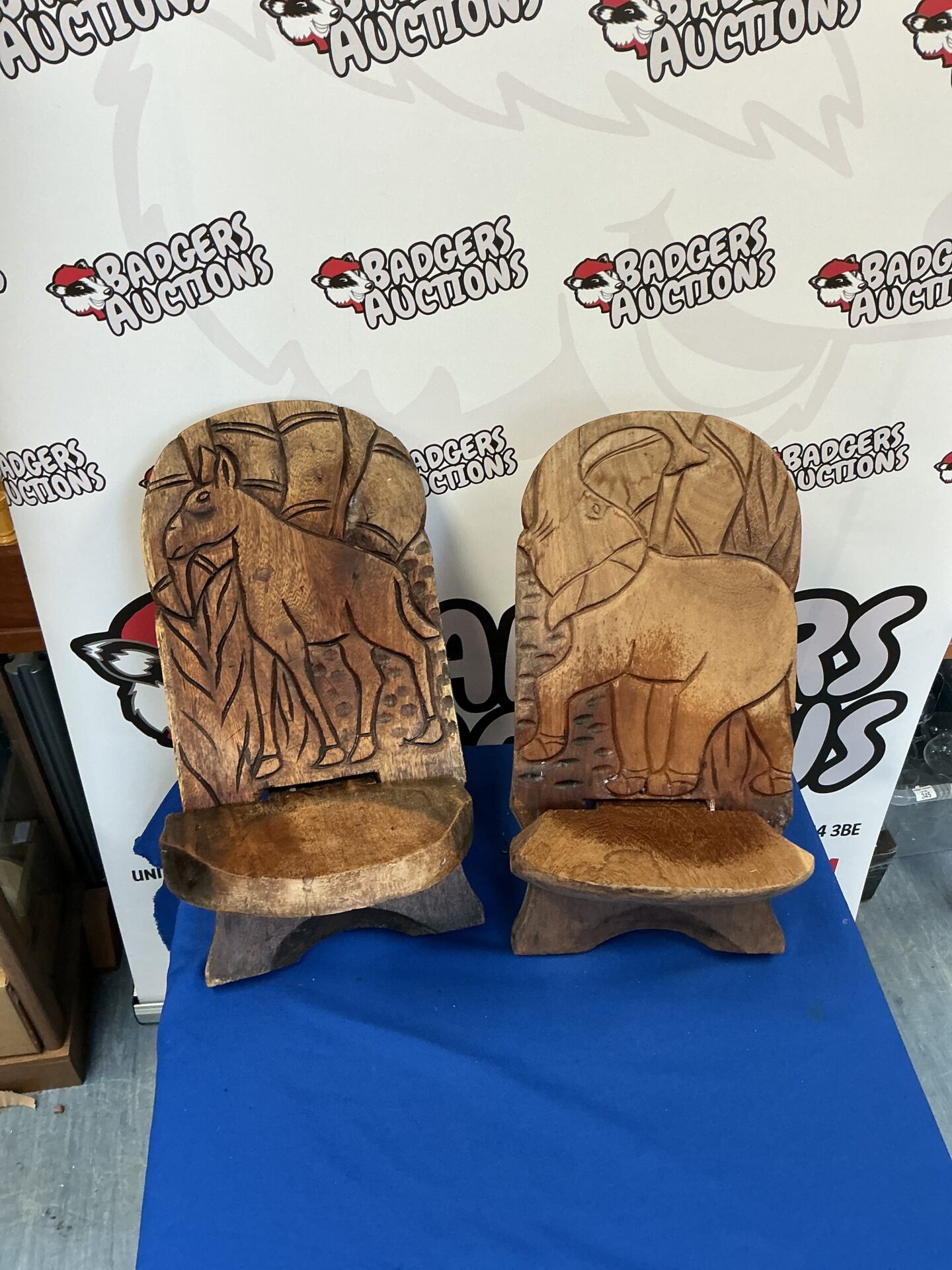These charming seats are beautifully hand-carved, likely crafted as folk art pieces. The seats depict stylized faces, adding a unique and whimsical touch. Constructed from wood, these seats are designed for children, offering a rustic and primitive aesthetic that would complement a variety of decor styles.