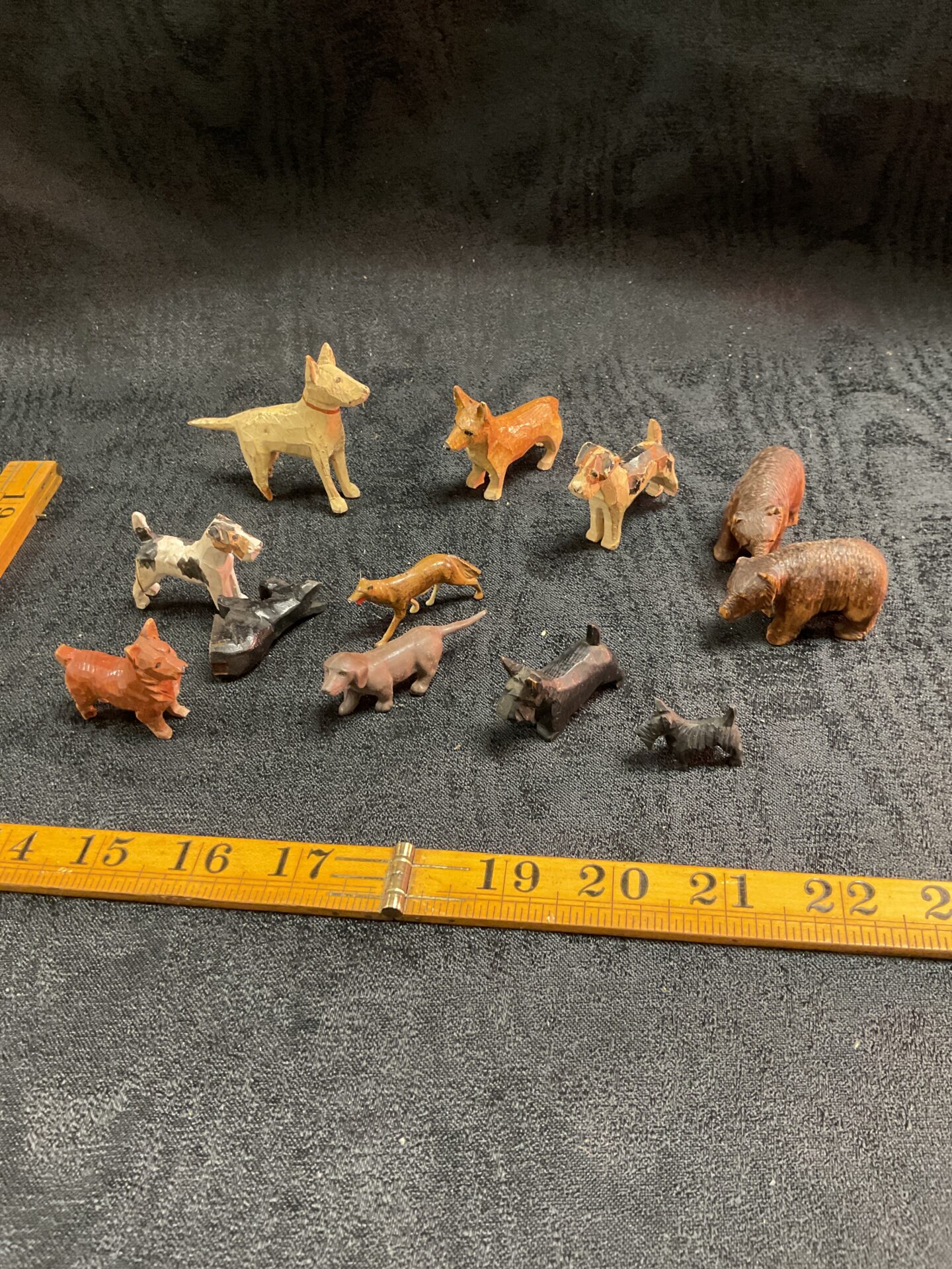 This charming collection features a variety of hand-carved wooden animals, including dogs and bears. The pieces exhibit a naive, folk art style, suggesting they were crafted by a self-taught artisan. The varying sizes and poses of the animals add to their character and appeal, hinting at a personal touch in their creation.