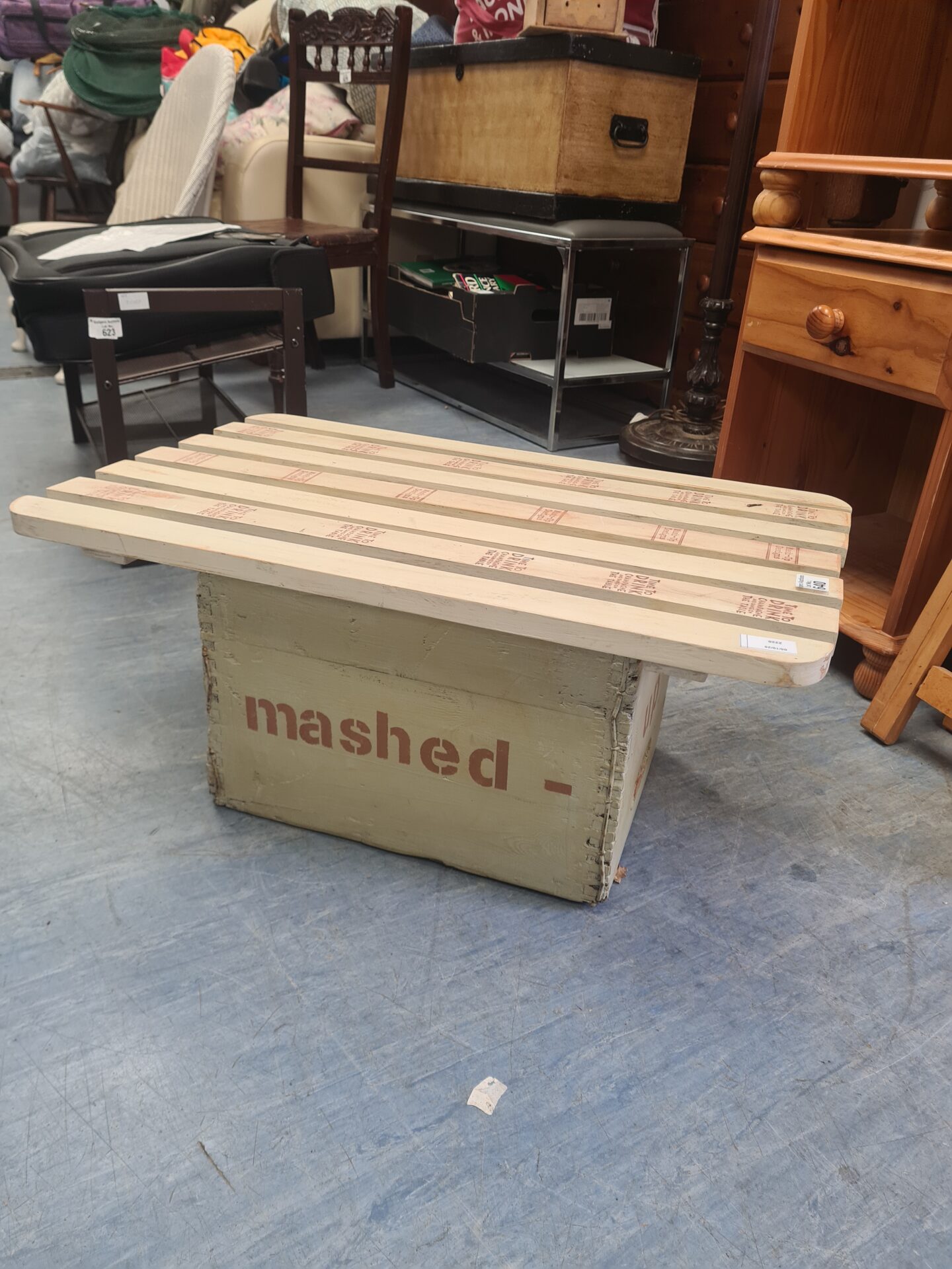 The table is in good condition, showing the natural character of reclaimed wood. It displays minor imperfections consistent with its handmade nature and age, adding to its charm and authenticity. This piece would appeal to collectors of unique, handmade furniture, those seeking a quirky addition to their home bar, or anyone who appreciates a touch of whimsy in their décor. It’s a statement piece that’s sure to spark conversation and bring a smile to your face.