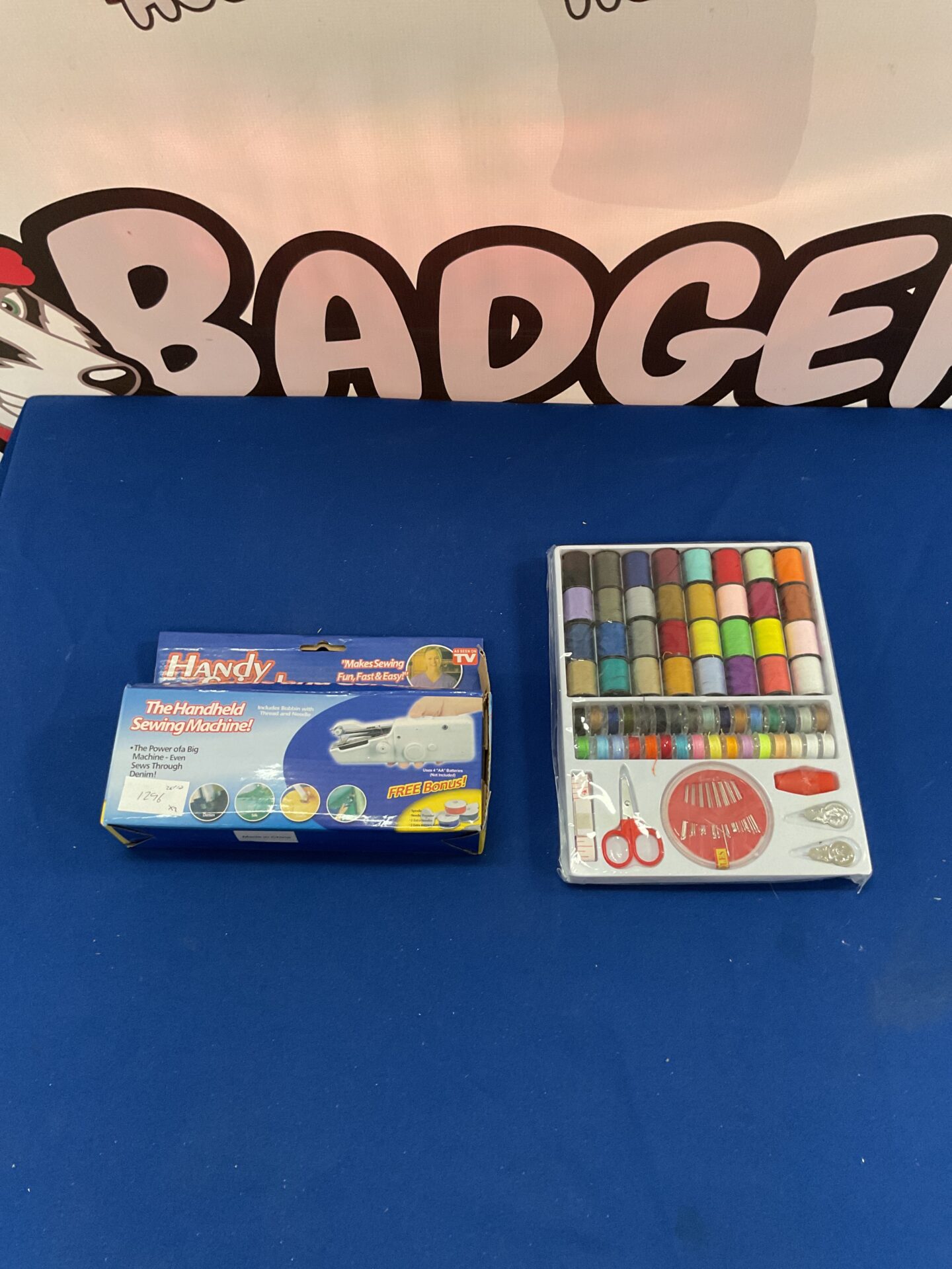 This is a Handy Stitch handheld sewing machine, a compact and portable solution for quick repairs and crafting projects. Designed for ease of use, this handheld device allows for stitching without the need for electricity or a traditional sewing machine setup. It comes with a selection of threads, making it a self-contained kit for on-the-go mending and creative endeavors.