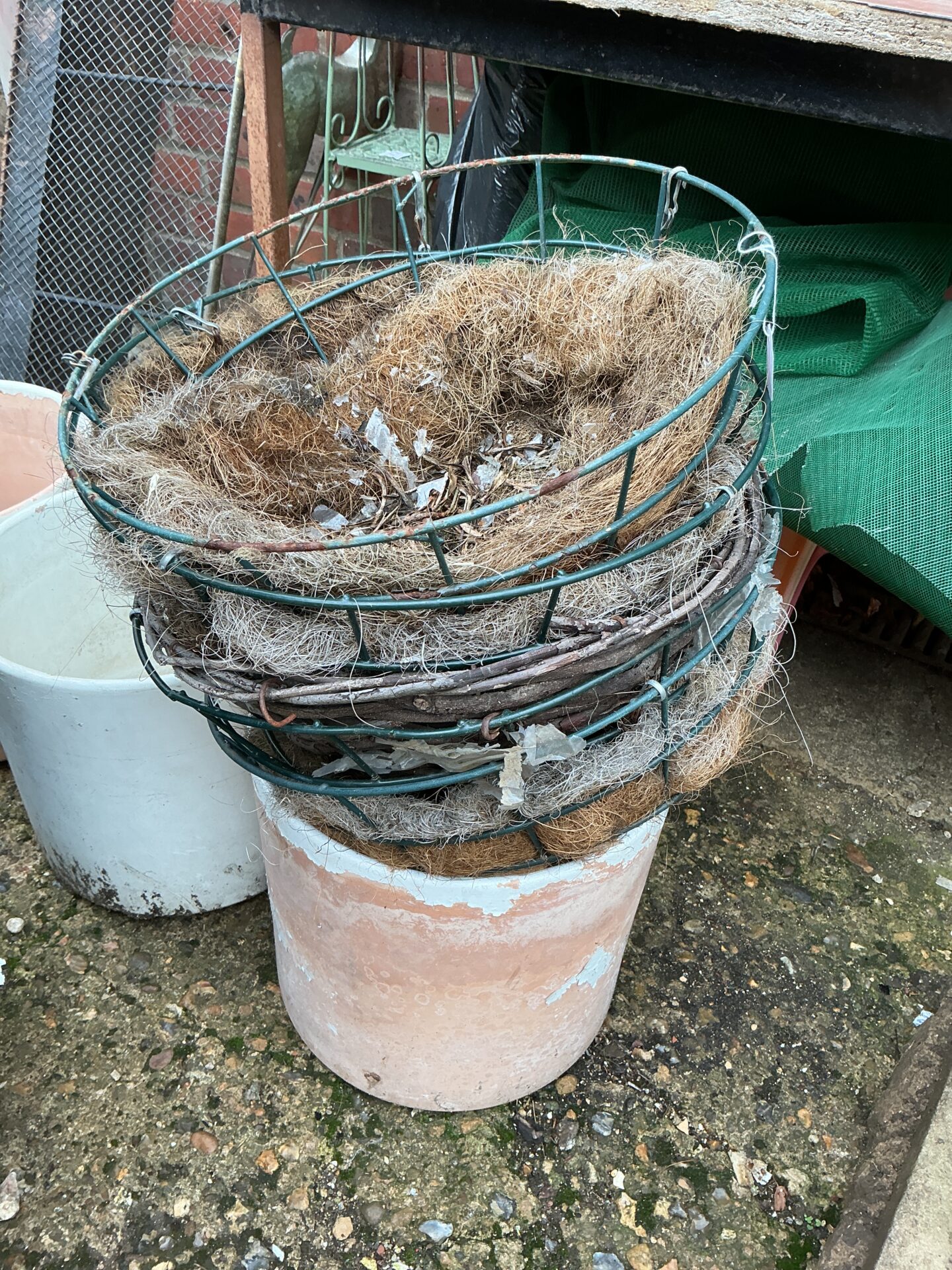 The baskets show signs of previous use and weathering, with some discolouration and wear to the wicker. They are offered in their original condition, presenting an opportunity for restoration or a rustic, aged appearance. These baskets may appeal to garden enthusiasts, collectors of vintage garden items, or those seeking affordable outdoor decor.