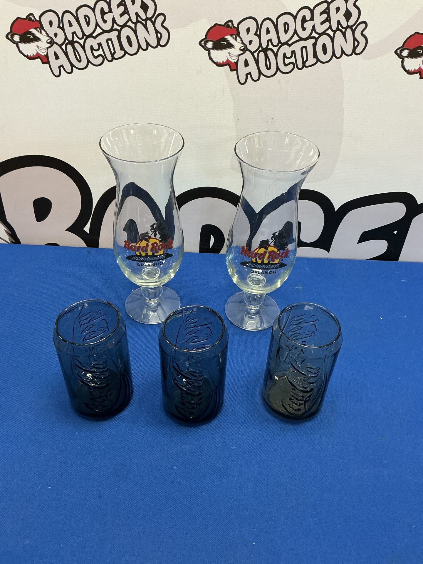 This lot features two Hard Rock Hurricane glasses originating from Orlando, Florida, alongside three classic Coca Cola glasses. The Hard Rock glasses showcase a tall, flared hurricane shape, designed for tropical cocktails, and bear the iconic Hard Rock branding. The Coca Cola glasses are a timeless addition, representing a beloved beverage brand and offering a versatile option for everyday use or display.